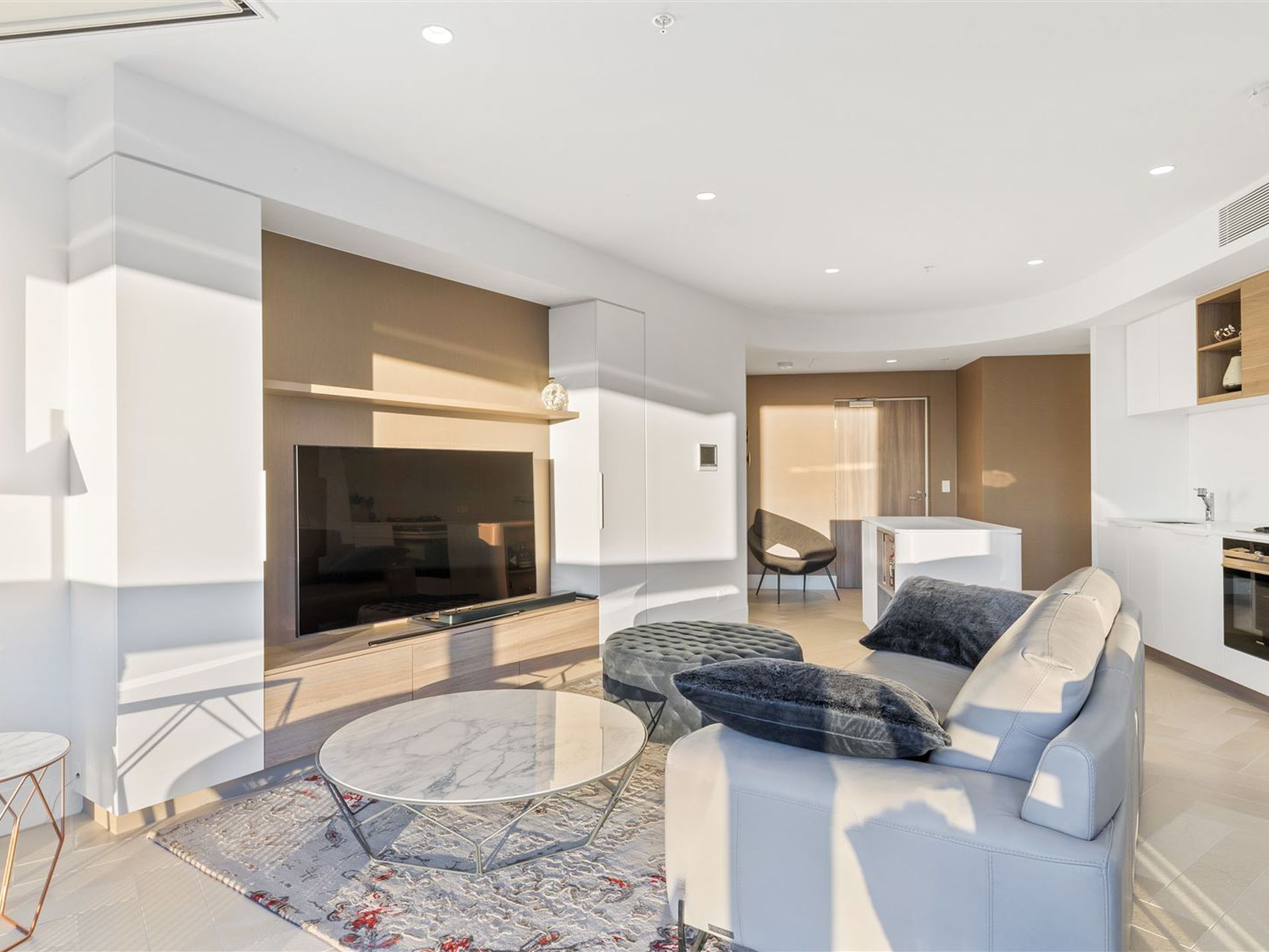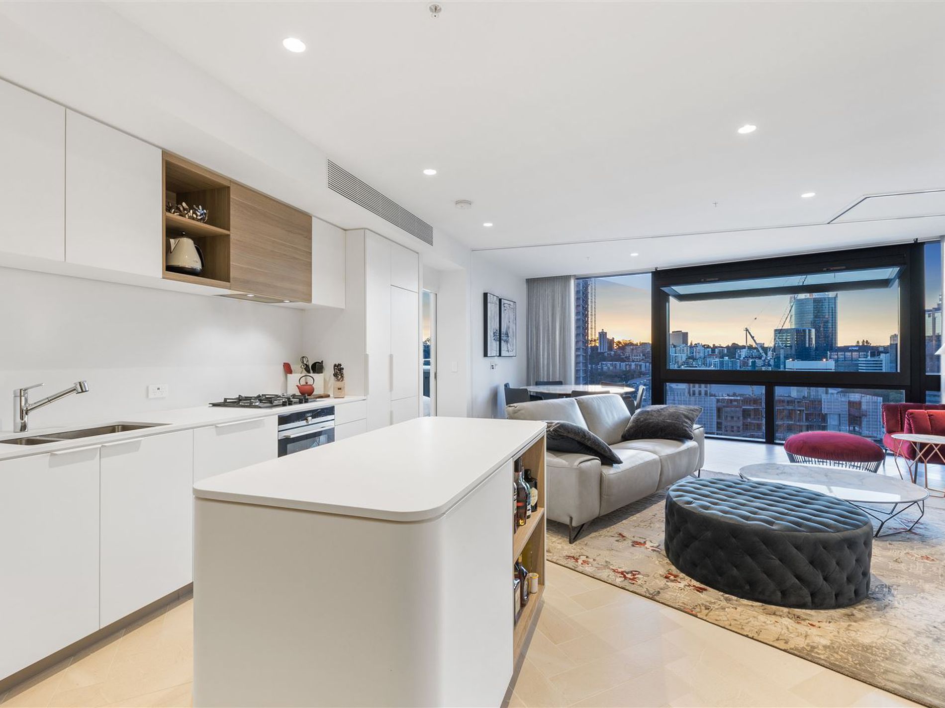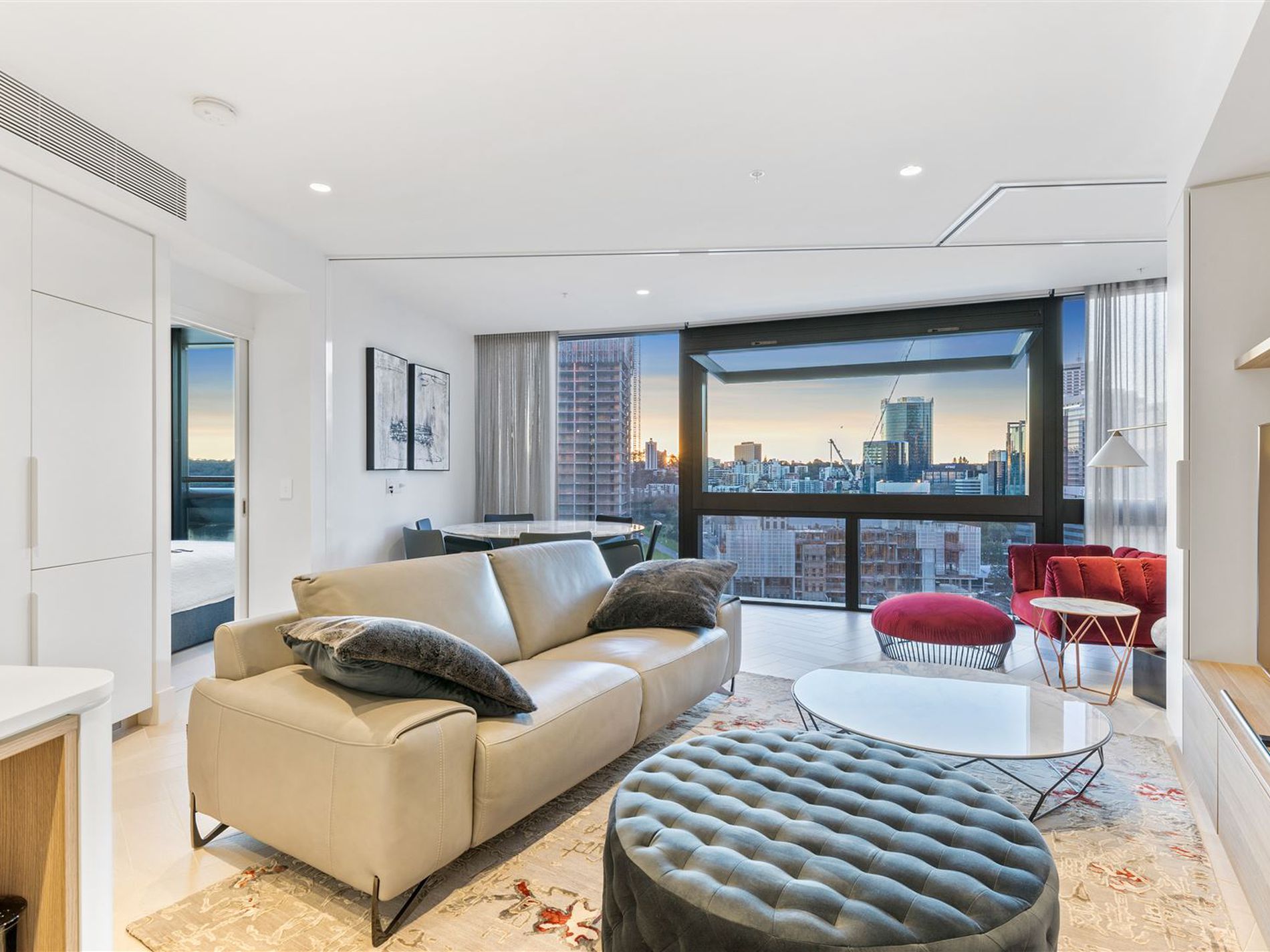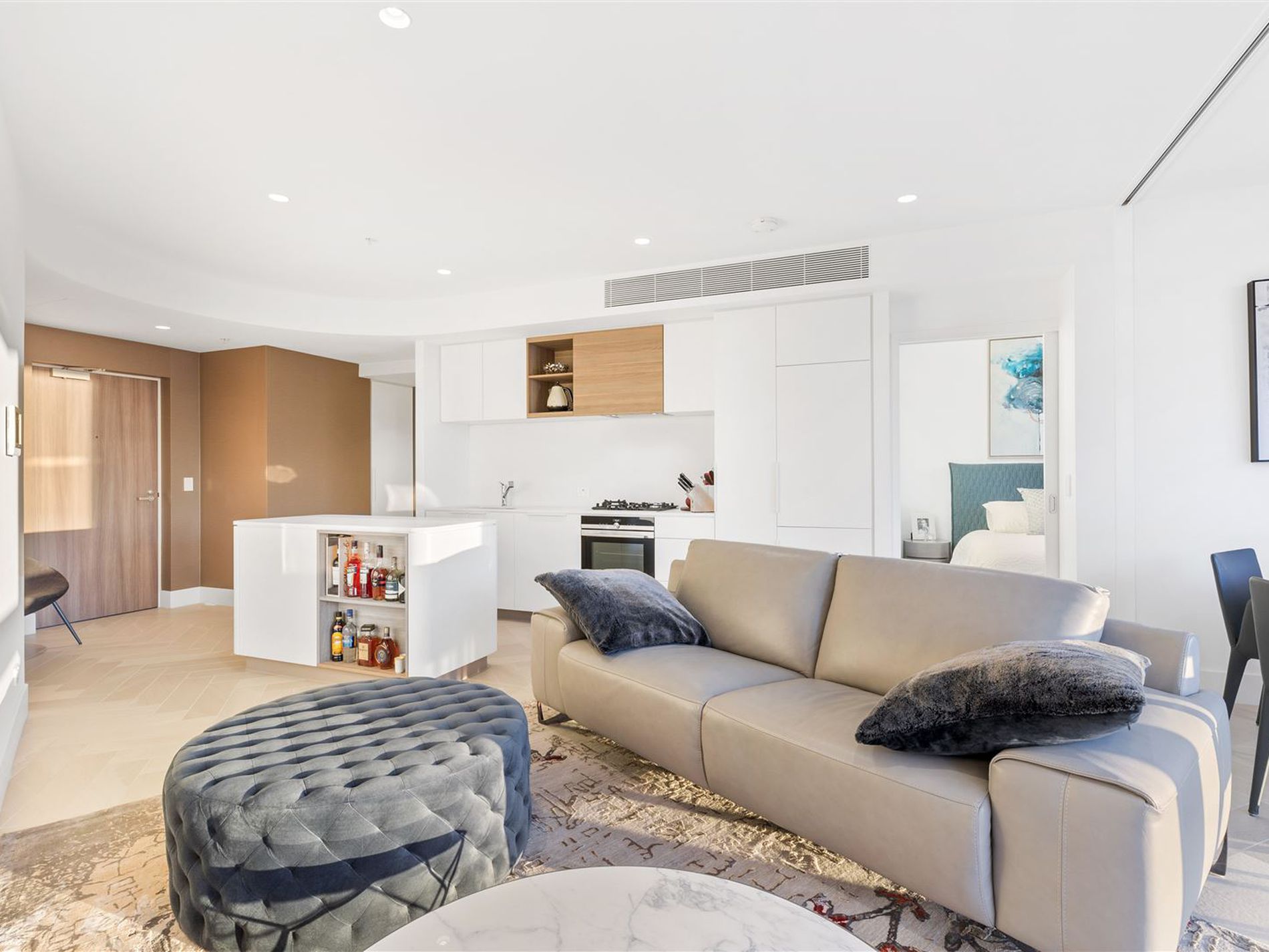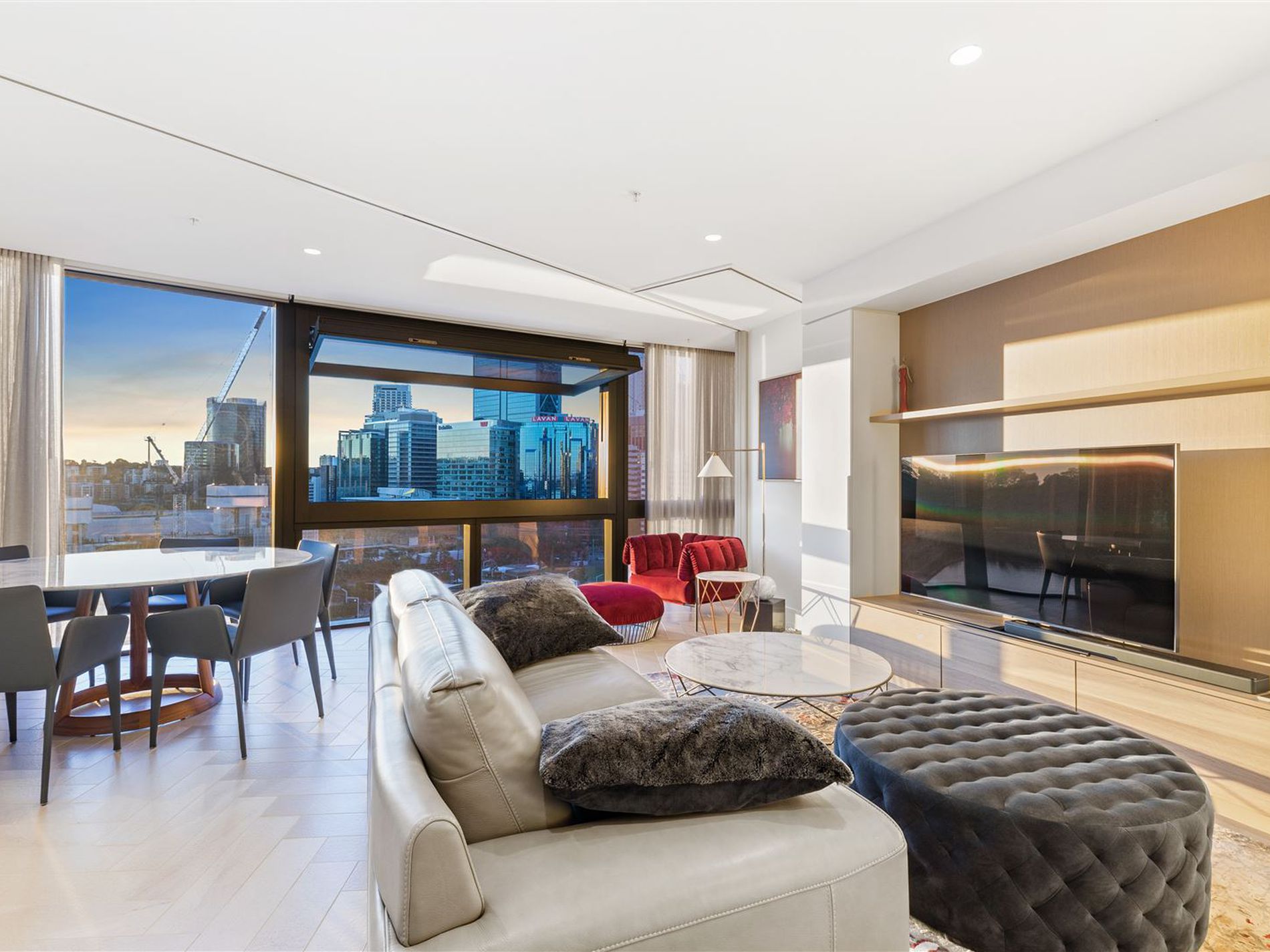 The voluminous central living area boasts a dramatic wall to wall, floor to ceiling glass facade perfectly indulged with vista of the dynamic Elizabeth Quay and Perth city in the background. Continuously bathed in the abundance of natural light, the apartment is generously spacious and suitable for entertaining and in-home gastronomic dining from the gourmet kitchen. Matching designer furniture is also available to purchase.