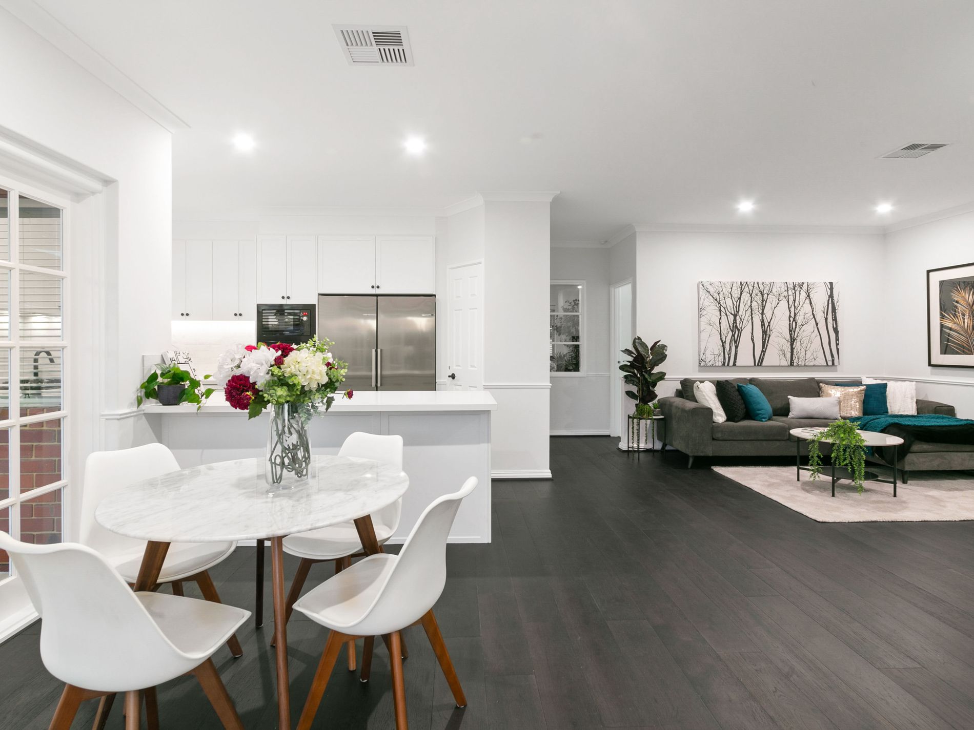 Stepping inside, you'll discover a light-filled interior with high ceilings overhead, crisp white walls, quality LED lighting, white wooden Venetian blinds, modern fixtures and tablet-controlled reverse cycle air-conditioning for year-round comfort. Chocolate-coloured American hickory wood floorboards flow underfoot in the main living spaces, and in the bedrooms, you'll enjoy plush carpets for added comfort.