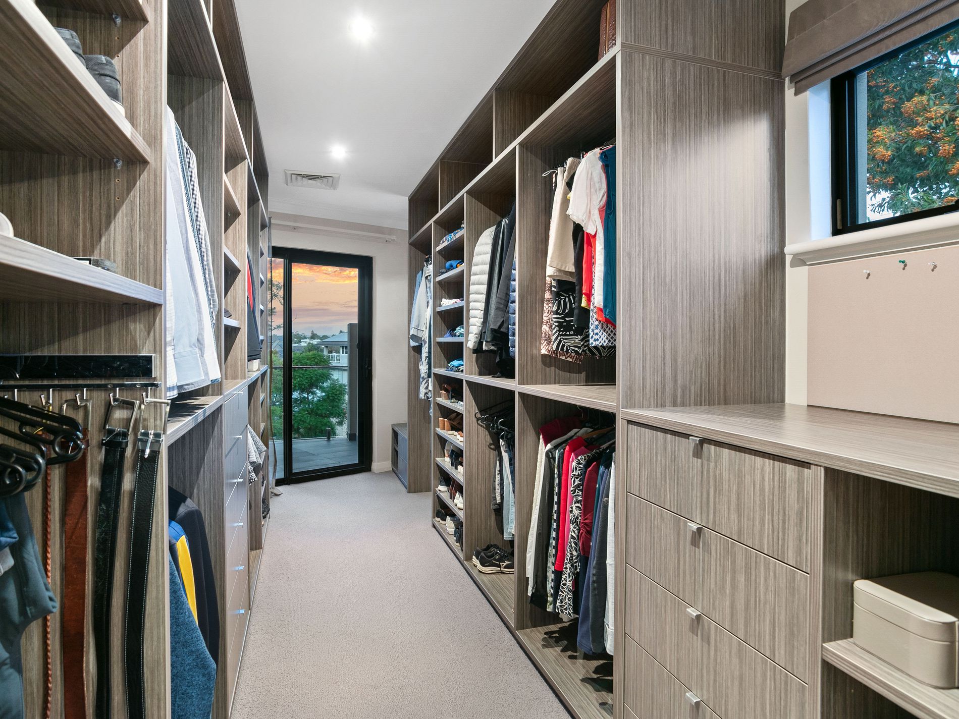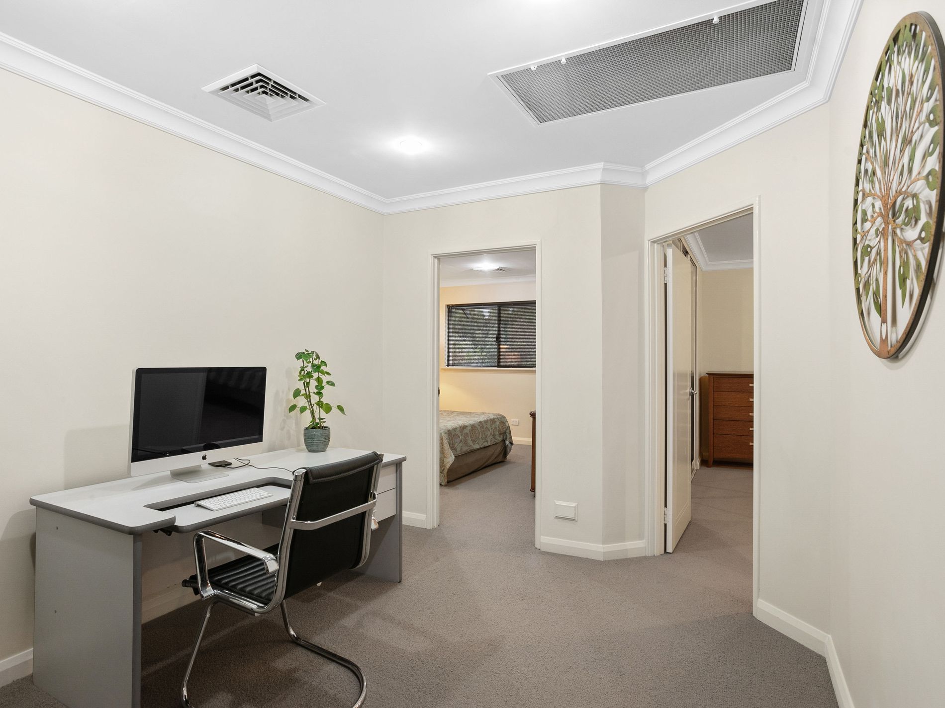 The other two bedrooms are queen-sized and equally as impressive. One of them has a walk-in robe and an ensuite with a connected laundry chute, while the other has a wall-to-wall built-in robe and its own ensuite. Connecting the two rooms is an activity hall that offers plenty of natural light, making it an ideal space for use as a study. It also comes equipped with a laundry chute for added convenience.
