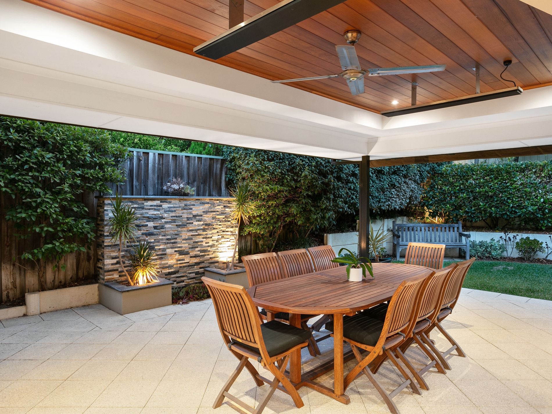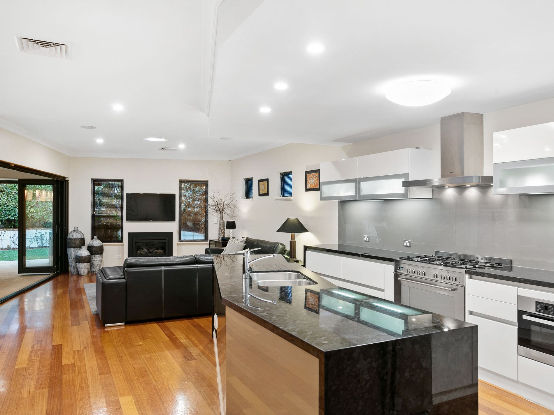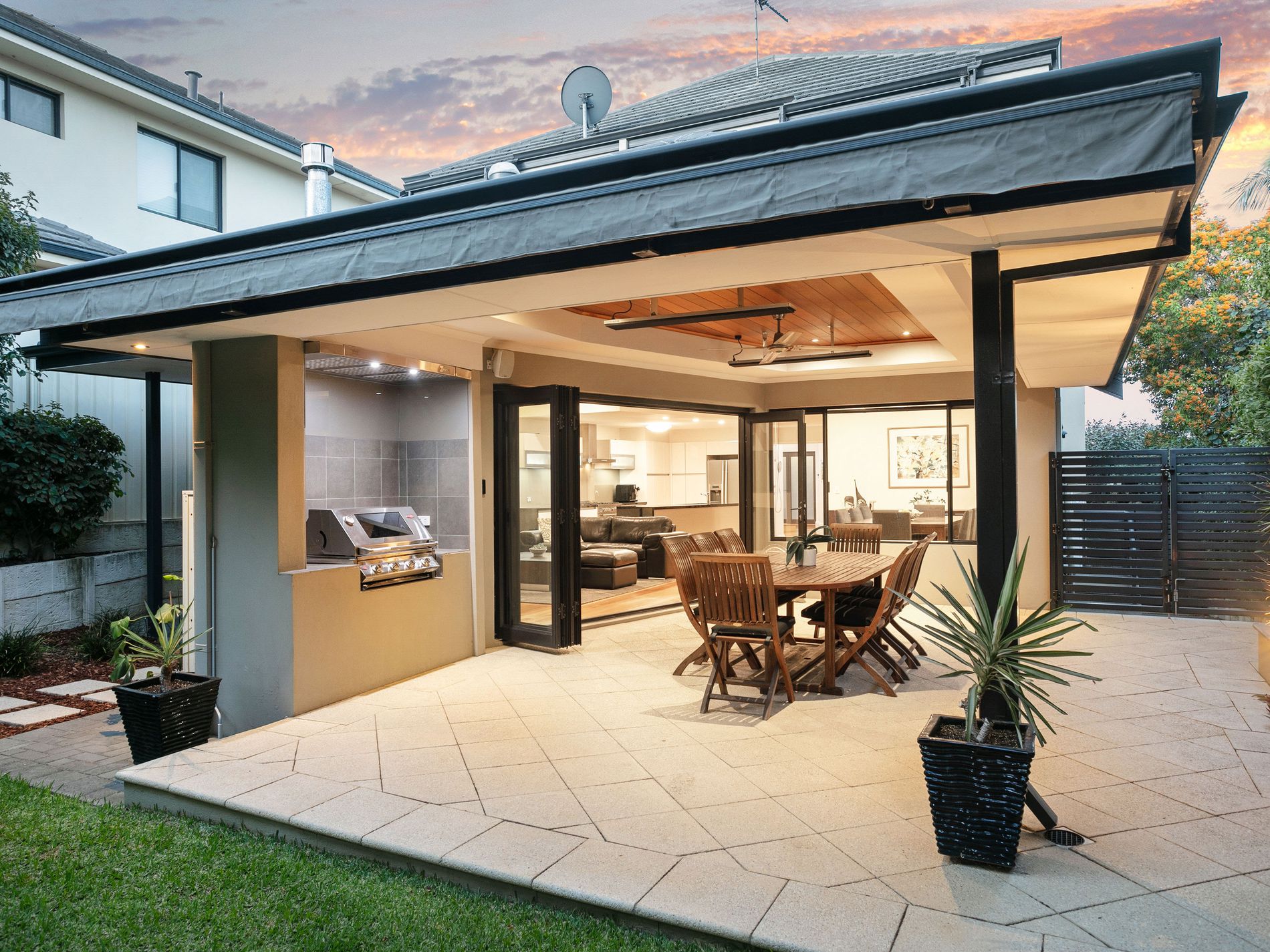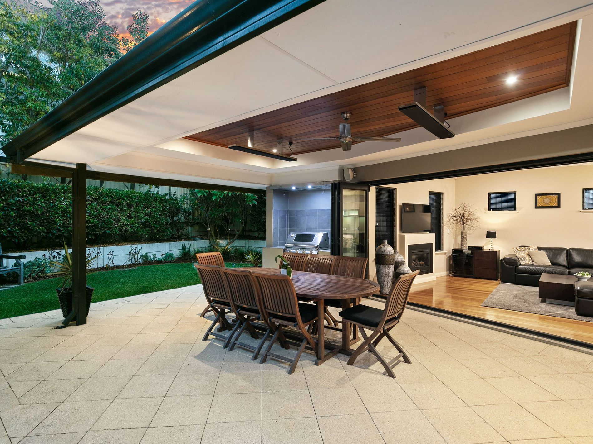 The large dining area is perfect for hosting guests, with enough space to comfortably seat 8 to 10 people. Opposite the dining area is a spacious and intimate living area, featuring a built-in gas fireplace and an above-head skylight which provides plenty of natural light. Adjacent to this space is a massive alfresco area which opens up via large, origami-style doors. The alfresco area is perfect for entertaining and includes a Beef Eater barbecue and exhaust system, and enough space for a 10 or 12-seater dining table. Equipped for year-round comfort, the alfresco area has overhead heat strips for the winter and a fan to keep cool during summers.