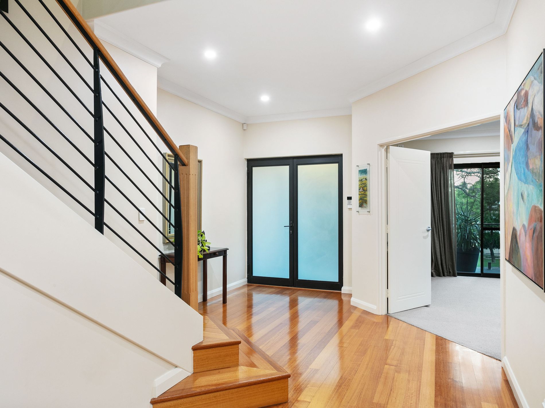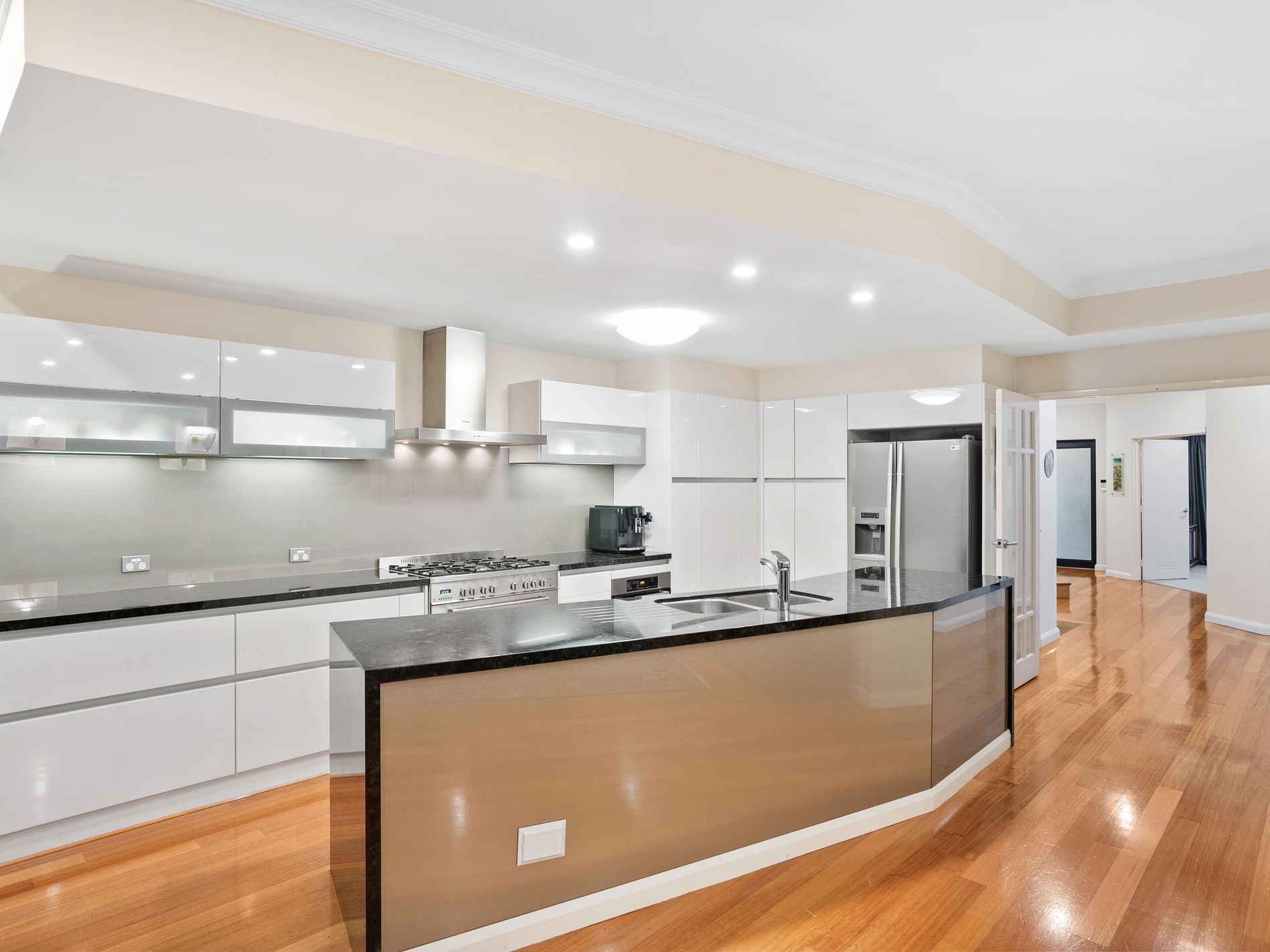 The first floor of the home boasts a 32-course ceiling height, creating a grand and impressive atmosphere. The large theatre room has surround sound provision and connects to a spacious balcony offering stunning views of the jacaranda trees. The open-plan living area features modern black butt floorboards, stone top benchtops, Miele microwave and grill, an integrated dishwasher, rangehood, and a Delonghi professional gas cooktop with an extra-wide oven. Additionally, the fridge space is plumbed in for convenience.