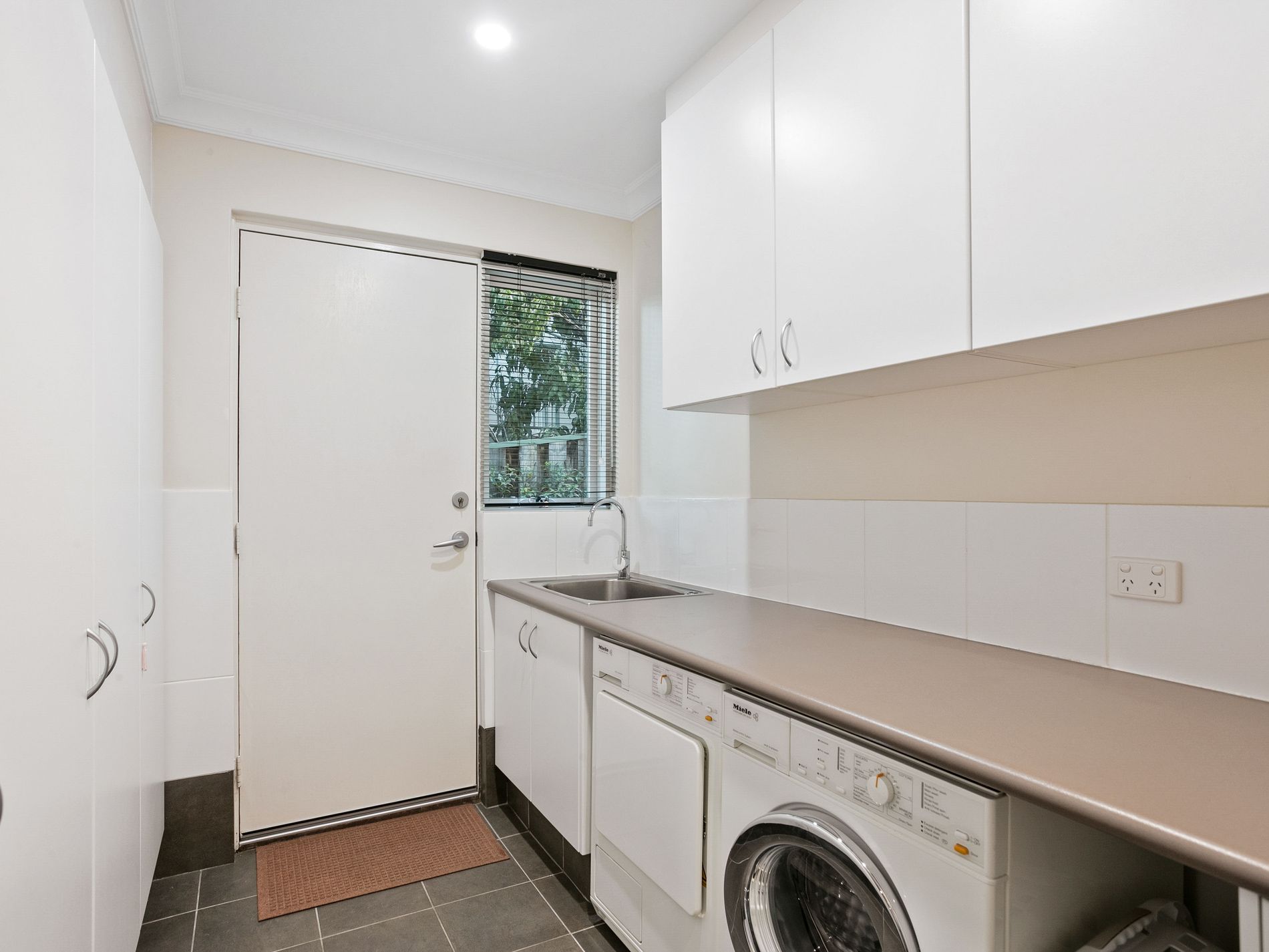 The first floor also features a fully equipped guest bedroom/study with a wall-to-wall built-in robe and an attached ensuite with a large shower and toilet. The ensuite adjoins a massive laundry room with ample cupboards and bench space, as well as its own secluded outside laundry hanging area.