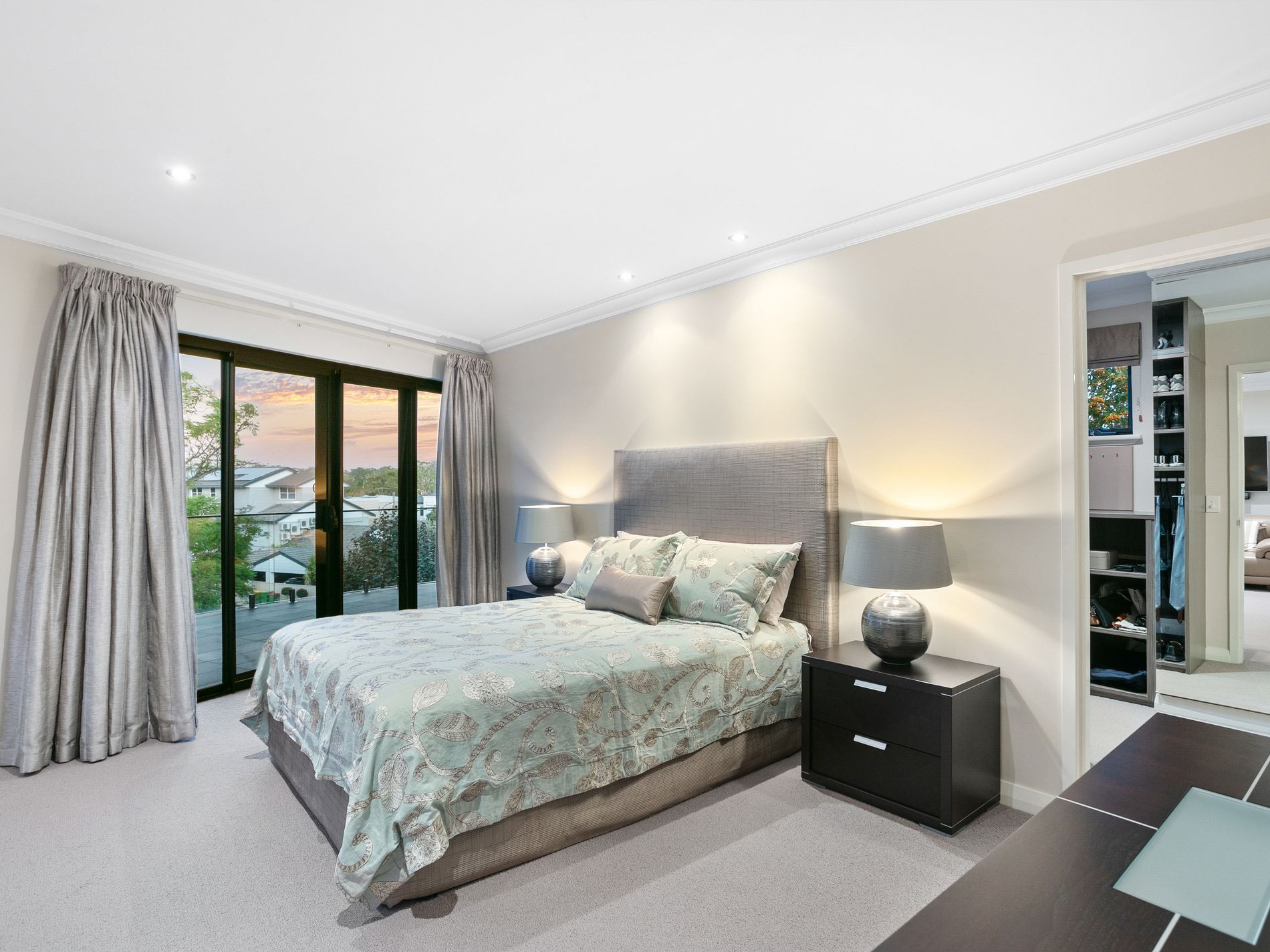 The second floor of the house is where the three generously sized bedrooms are located, each with its own ensuite. The master bedroom is particularly remarkable, featuring a king-sized suite, lounge area with an abundance of natural sunlight, and breathtaking views of the city and river. The master bedroom also includes a walk-in robe that leads to a luxurious 5-star hotel-style ensuite with a double vanity, freestanding bath, and an enormous hobless shower. The master bedroom also boasts a very spacious balcony that is perfect for relaxing and reading a book while surrounded by the beautiful jacaranda trees and ever-changing colors. From the balcony, you can also enjoy the stunning views of the city and catch glimpses of the Swan River.