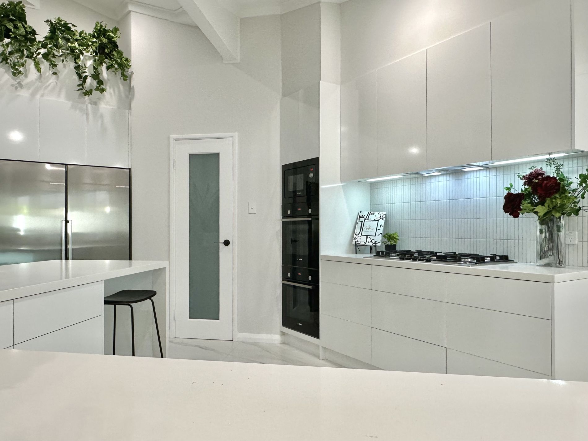 Designed for seamless entertaining and family living, this spacious open-plan area features a stylish kitchen with white gloss cabinetry, handle-less design, top-of-the-line Bosch appliances, and a SMEG dishwasher. The oversized porcelain Carrera marble look tiles in the kitchen and entry, combined with the high-pitched ceilings, create an inviting atmosphere for gatherings and everyday living.
