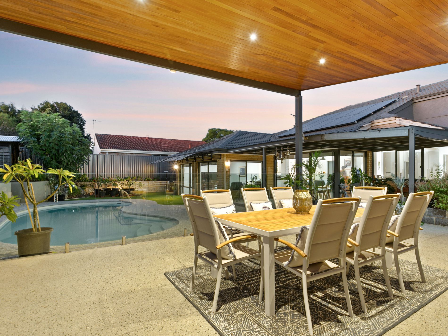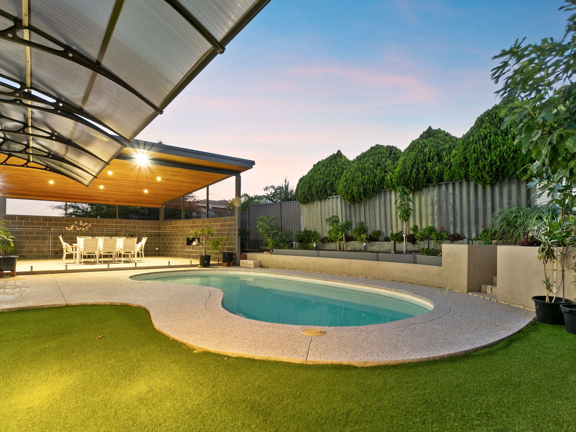 The alfresco area is remarkably expansive, providing numerous seating choices for comfortably accommodating up to 20 guests. This striking cedar-lined outdoor space is complemented by a fruit tree paradise, boasting an assortment of fruits such as chilli, curly leaves, basil, guava, figs, mango, blueberry, mulberry, and lemon. Low-maintenance synthetic lawns and gardens, an enchanting cubby house, and a glistening blue swimming pool encircled by glass fencing further enhance the backyard, creating a resort-like ambiance for family and friends to enjoy.