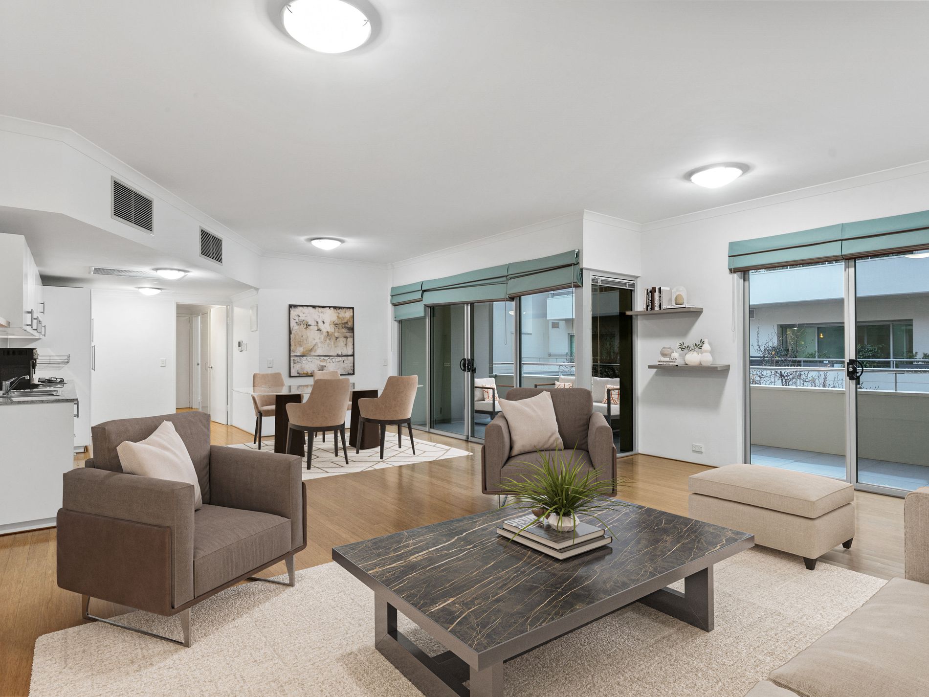 The spacious open-plan living area opens to the balcony through sliding doors, offering a seamless transition from indoor to outdoor spaces. Both areas are as perfect for entertaining guests and family as they are for quiet relaxation.