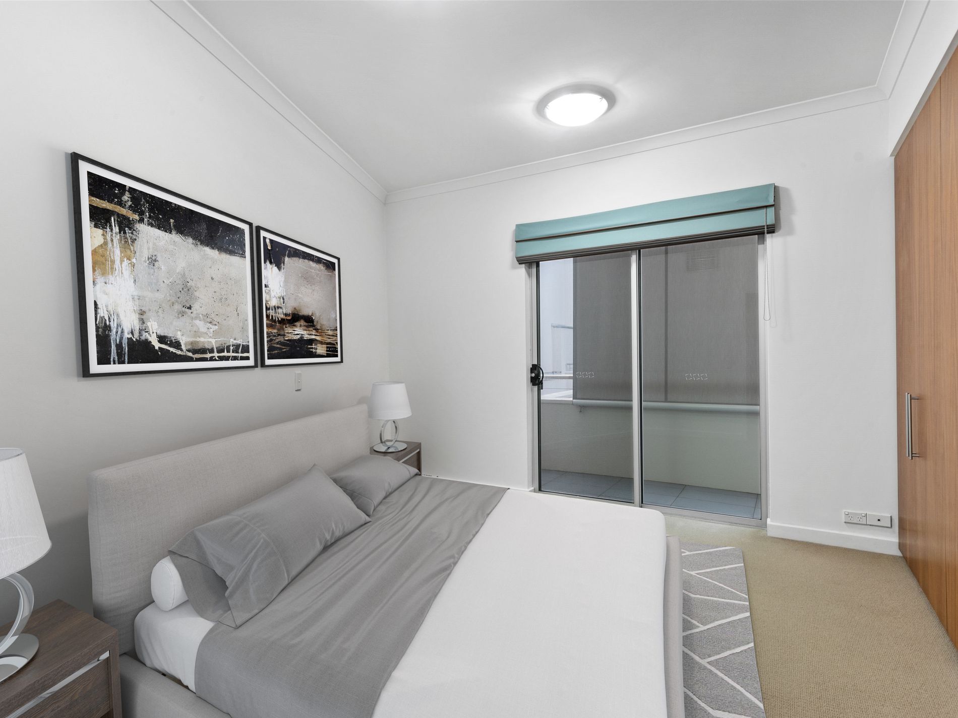 A remote retractable sunshade on the balcony allows for protected outdoor living, even at the peak of summer.