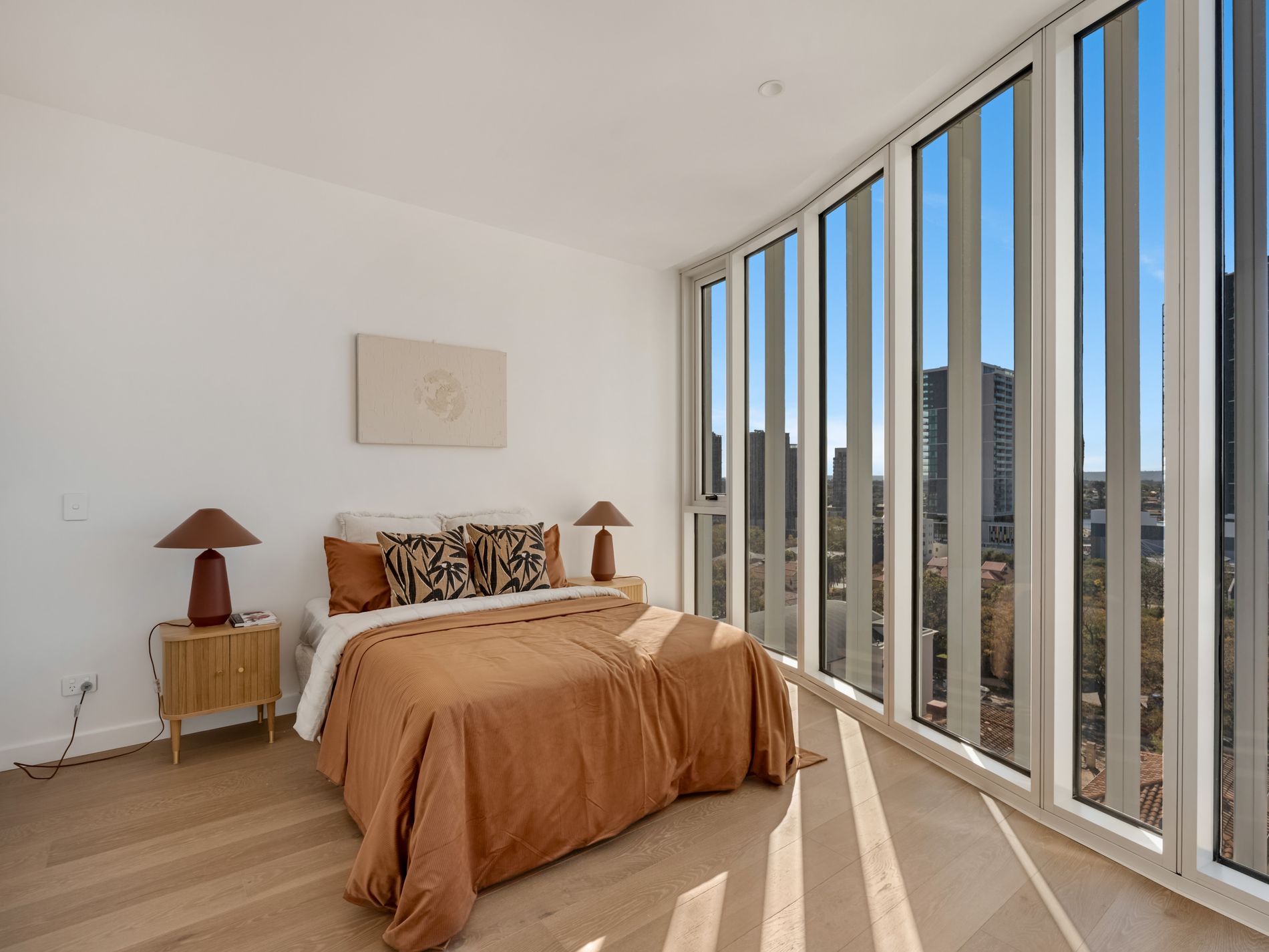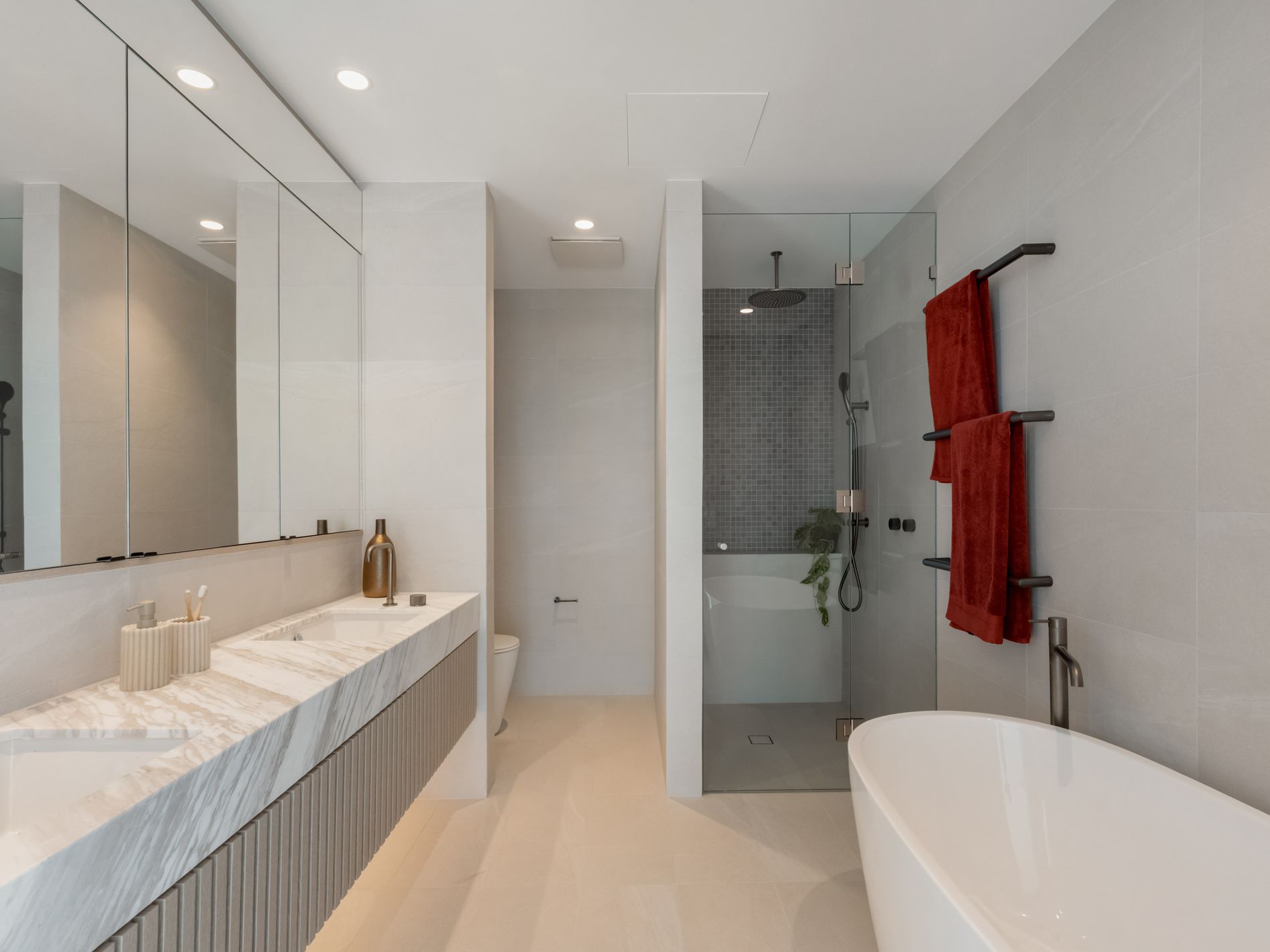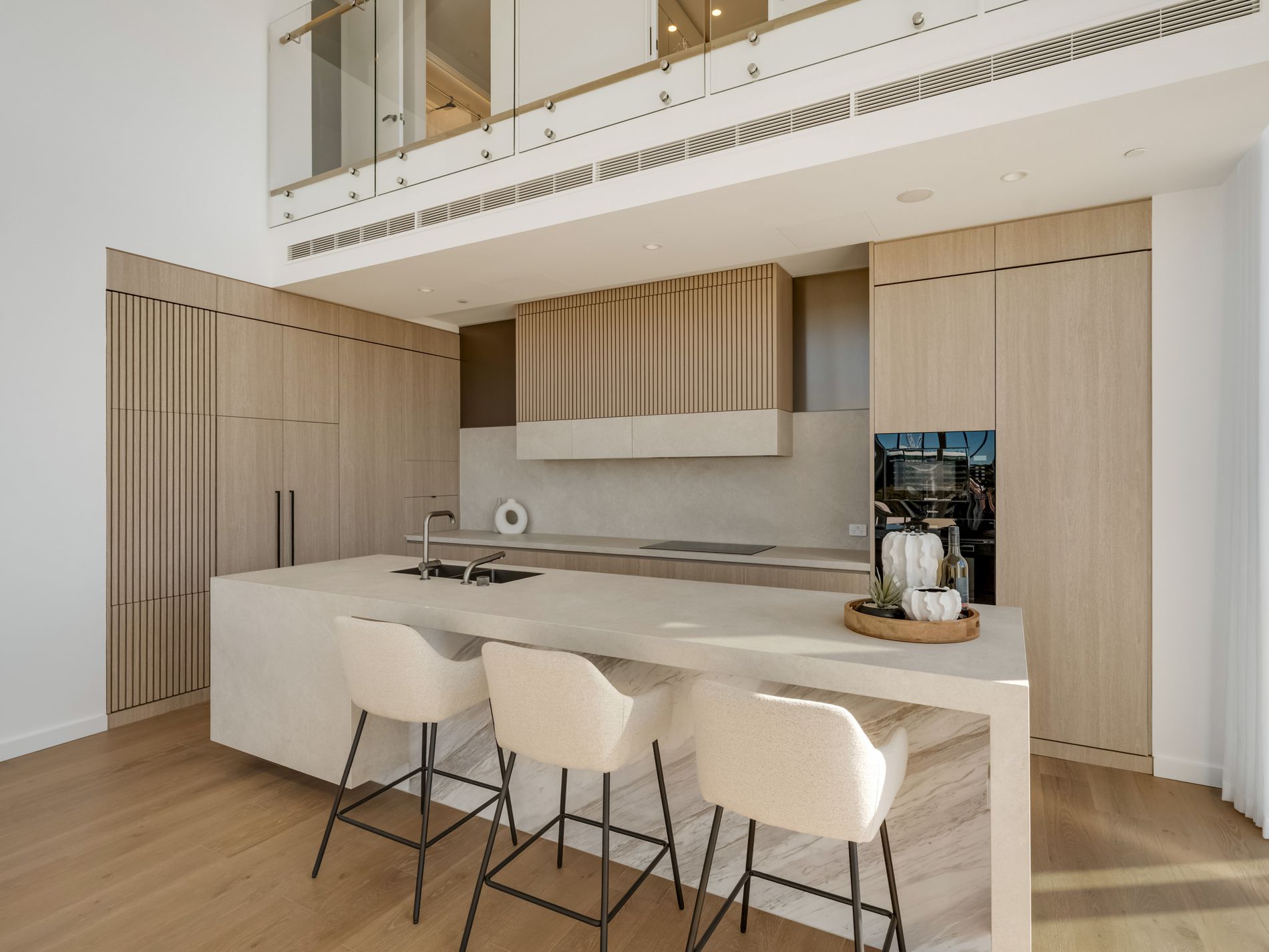 On the ground floor you will find two bedrooms including a master suite with its own private balcony, spacious walk in robe and luxurious ensuite. An additional bathroom provides flexibility for guests or family. Upstairs a study nook complements a second master bedroom, complete with its own ensuite and the largest walk in robe in the building.