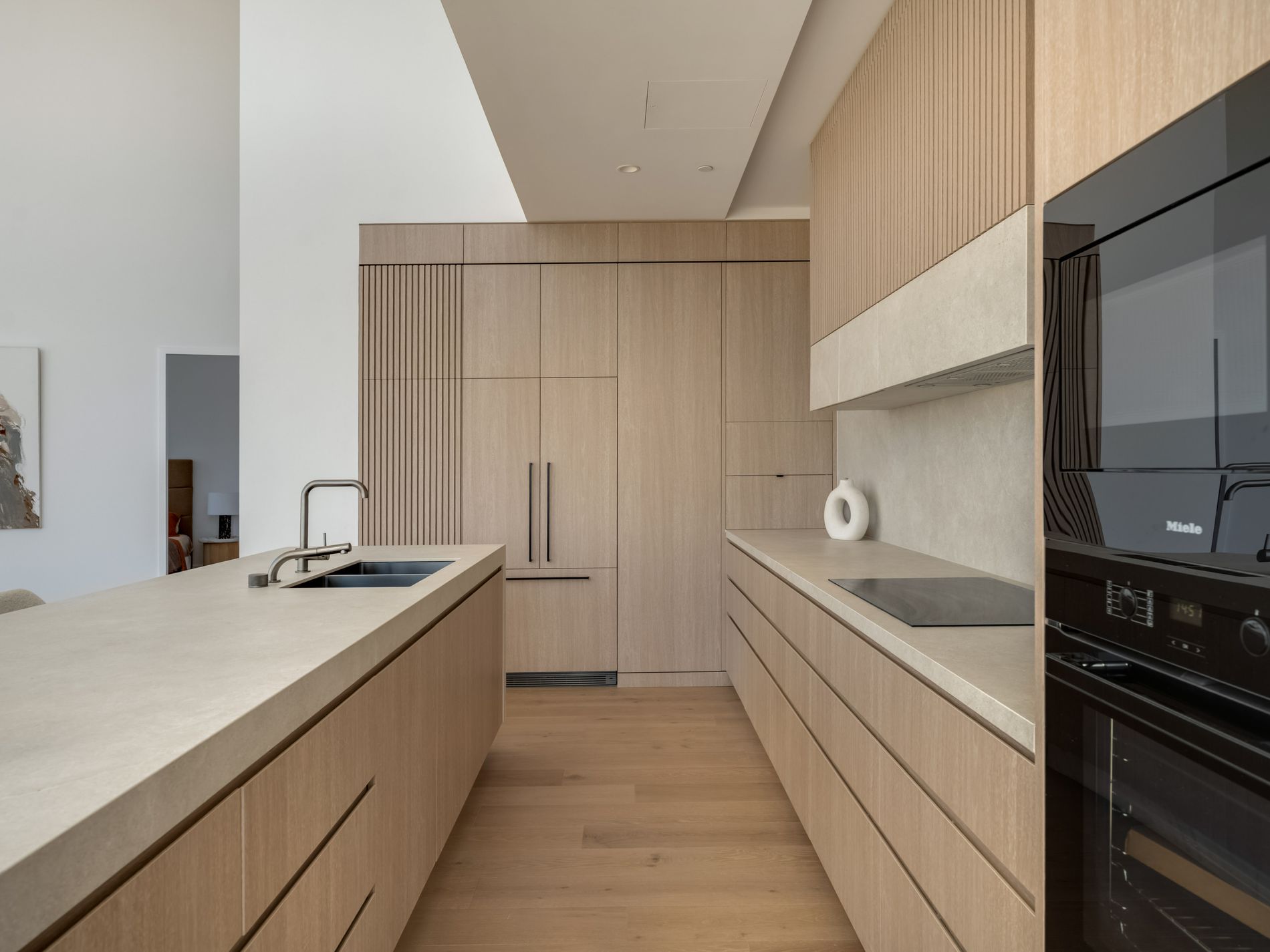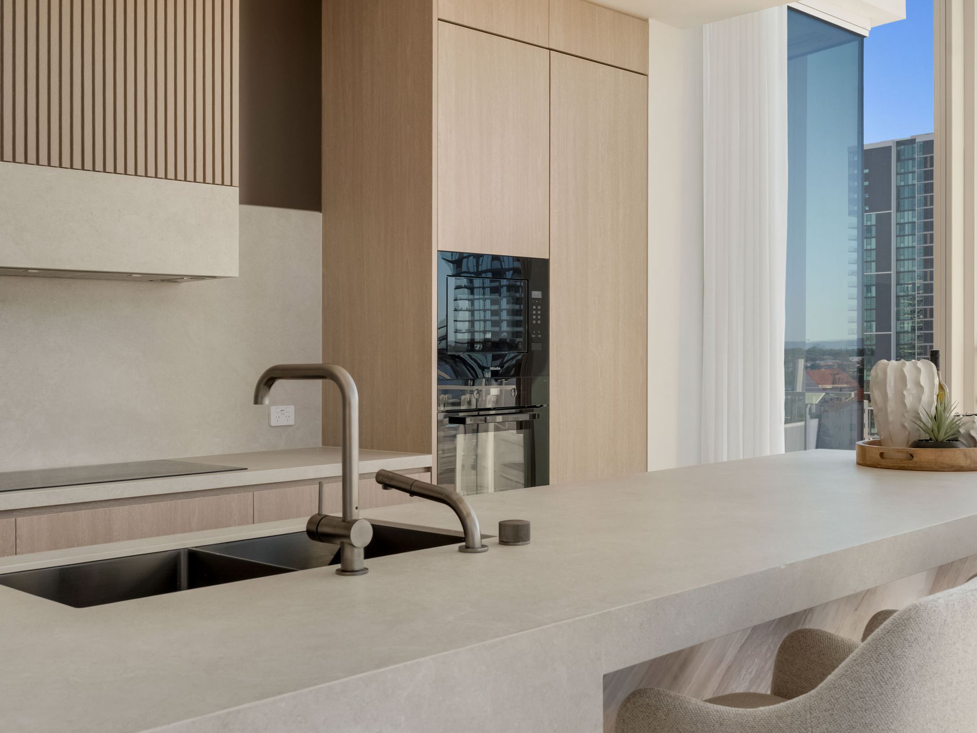 The entry opens to an expansive open plan living, dining and kitchen area, where a full length porcelain benchtop, top of the range Miele appliances and designer cabinetry set the tone for sophisticated entertaining. The living space flows effortlessly onto a large balcony, perfect for evening relaxation or gatherings with friends.