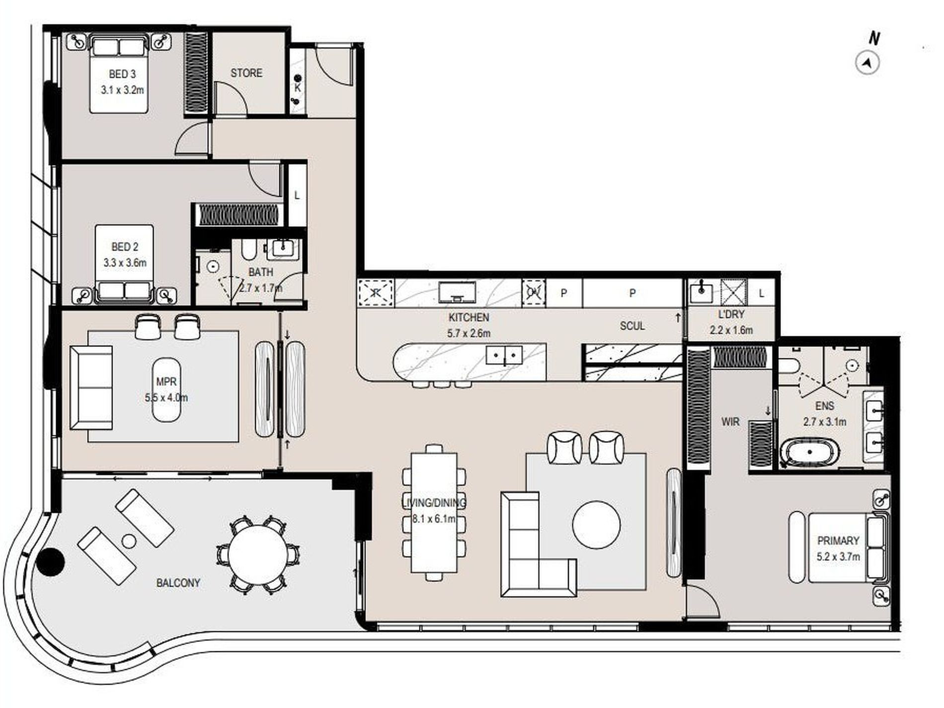 The vast living, dining and multi-purpose room spill out to the corner balcony to maximise the sweeping views and coveted indoor outdoor lifestyle.