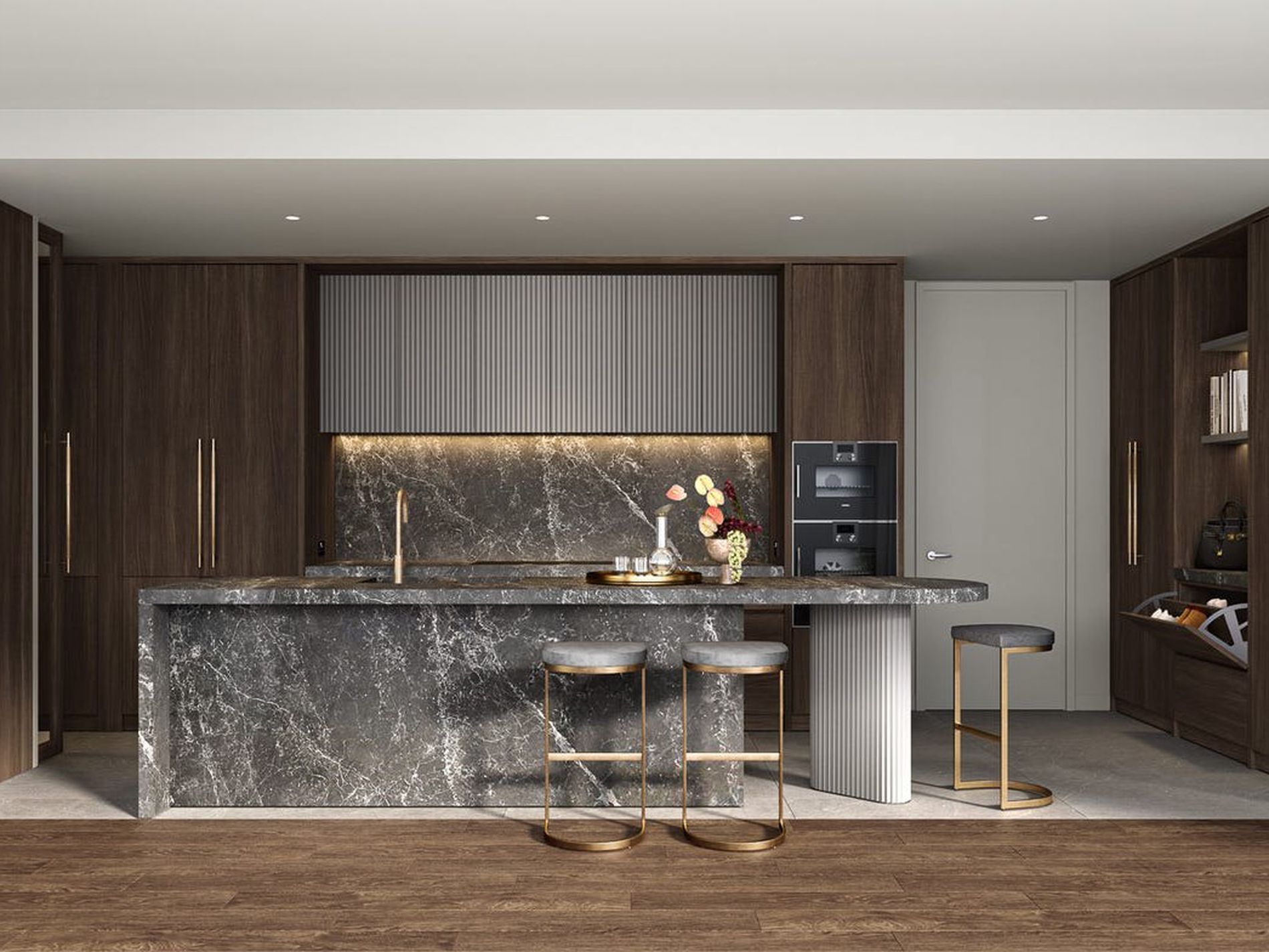 Equipped with top-of-the-line Gaggenau appliances, mineral stone benchtops, and ample storage in the scullery, this beautifully crafted space is perfect for hosting guests or enjoying memorable family dinners.