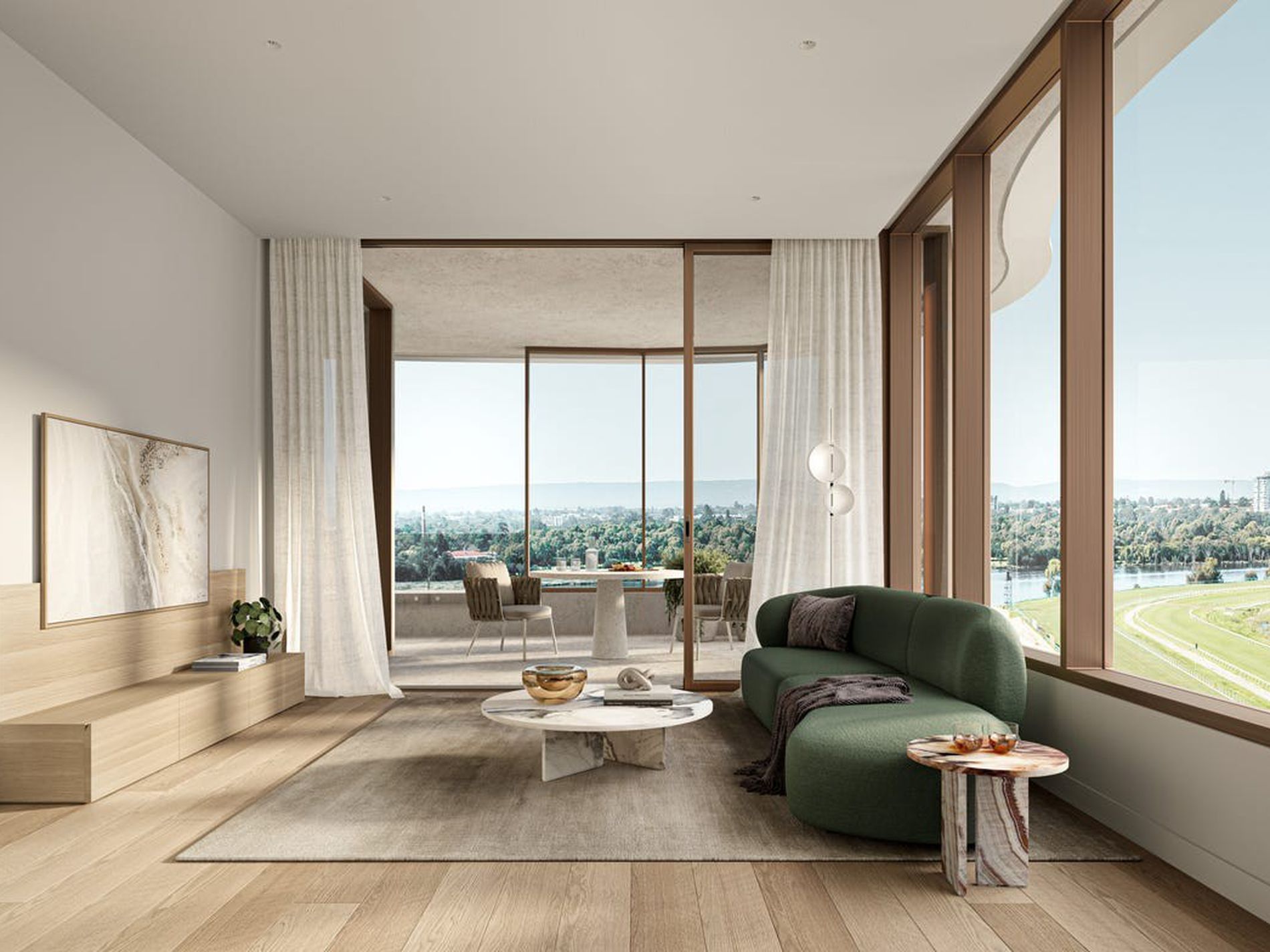 Step into a light-filled open-plan living area that flows seamlessly into a well-appointed kitchen, complete with premium finishes, ample storage, and elegant design that lends well to entertaining. The spacious layout is wrapped in full-height glazing and extends onto a private balcony, where you can soak in the dynamic energy of race days or simply unwind with a picturesque outlook.
