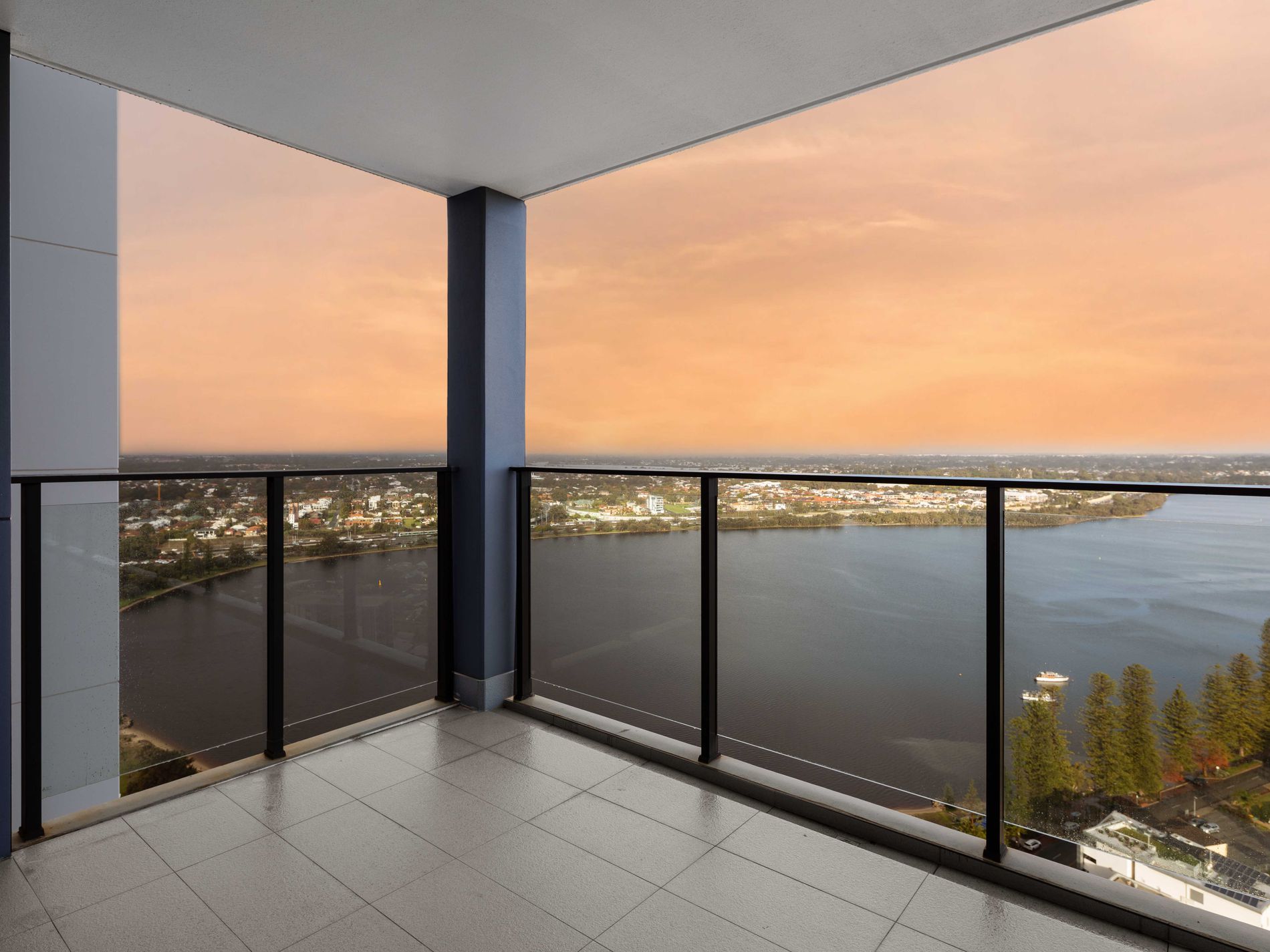 Located on high floor in Sabina Applecross, where luxurious design meets panoramic riverfront living. With sweeping views stretching across the Swan River and towards the city skyline, this residence is a showcase of refined style, light-filled interiors, and five-star convenience. Inside, a thoughtfully crafted open-plan layout connects the living, dining, and kitchen zones - all framed by full-height glazing that draws in the breathtaking surrounds. The gourmet kitchen is as functional as it is beautiful, appointed with stone benchtops, AEG appliances, a gas cooktop, integrated Bosch dishwasher, and a central island perfect for casual dining or entertaining. Two spacious bedrooms each enjoy direct balcony access and incredible outlooks. The master suite offers a walk-through robe and stylish ensuite, while the second bedroom includes built-in robes and is serviced by a well-appointed main bathroom with concealed laundry. Every detail is considered: engineered timber floors, double glazing, ducted air conditioning, and automated blinds.