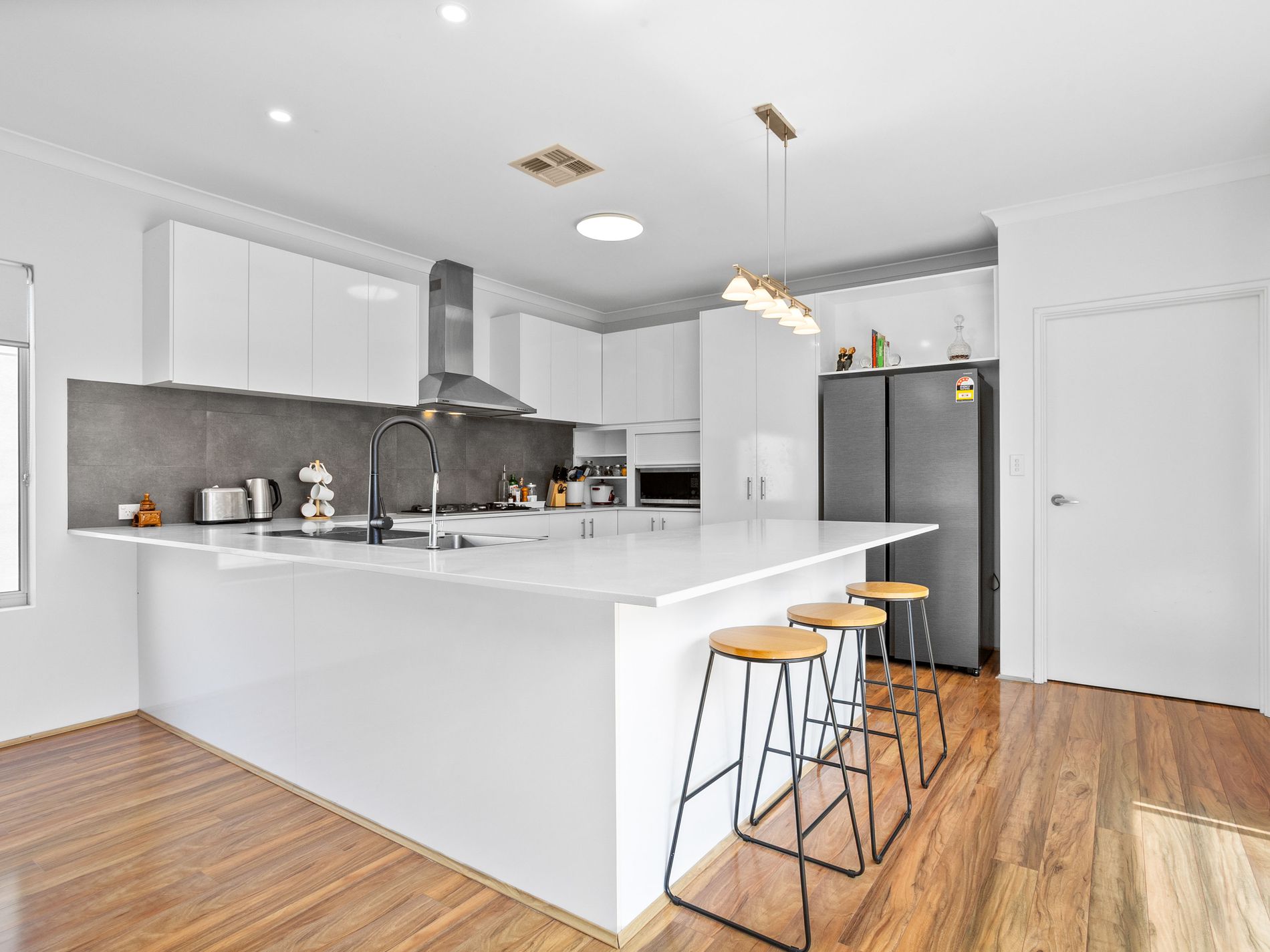 At the heart of the home, the well-appointed kitchen features generous storage and quality appliances including a 900mm cooktop and oven, connecting seamlessly with the open-plan living and dining areas.
