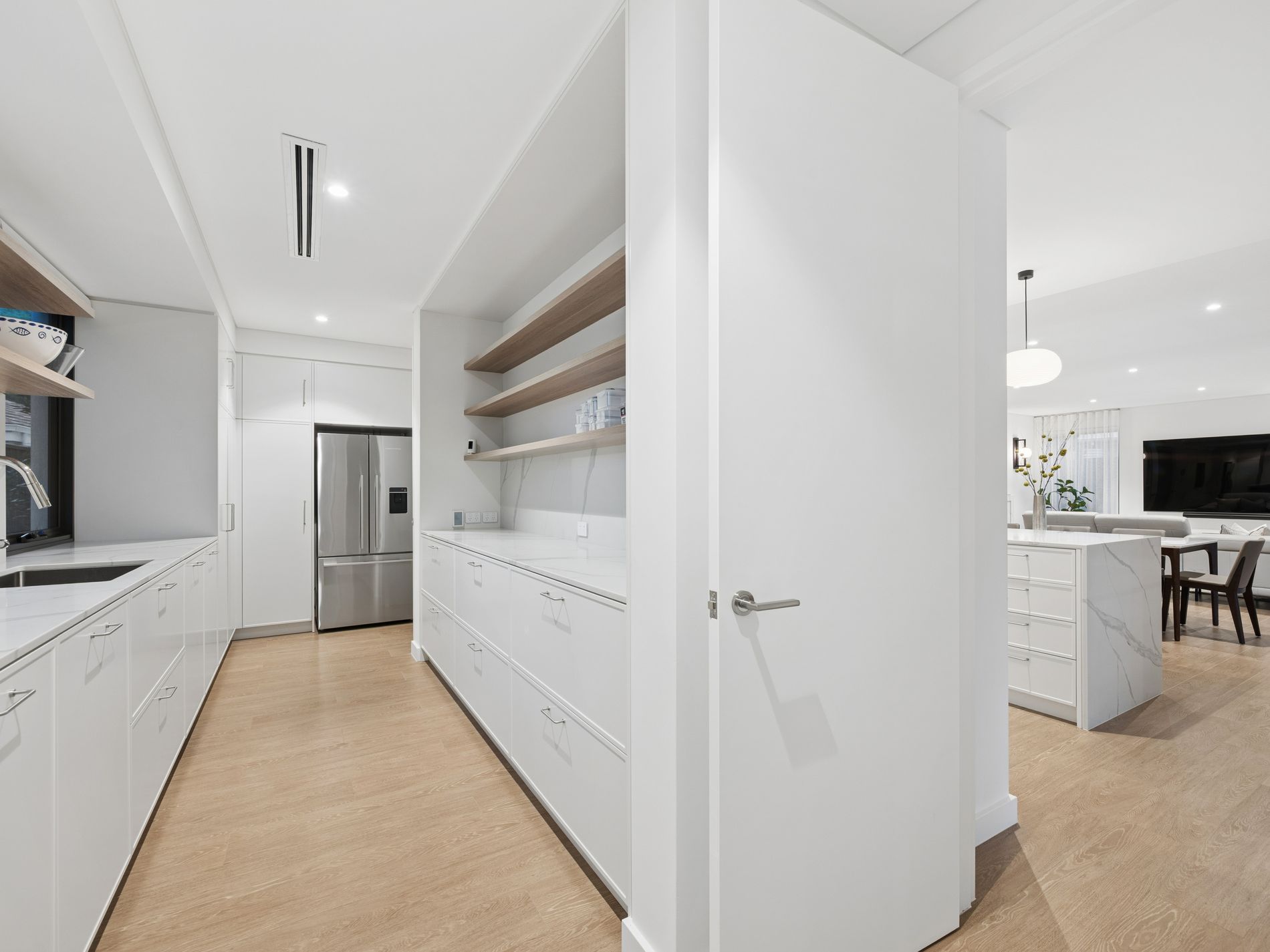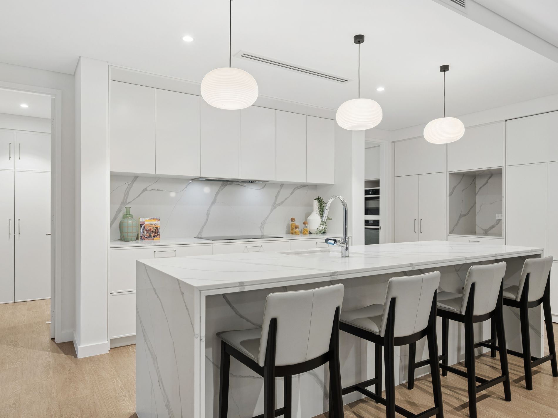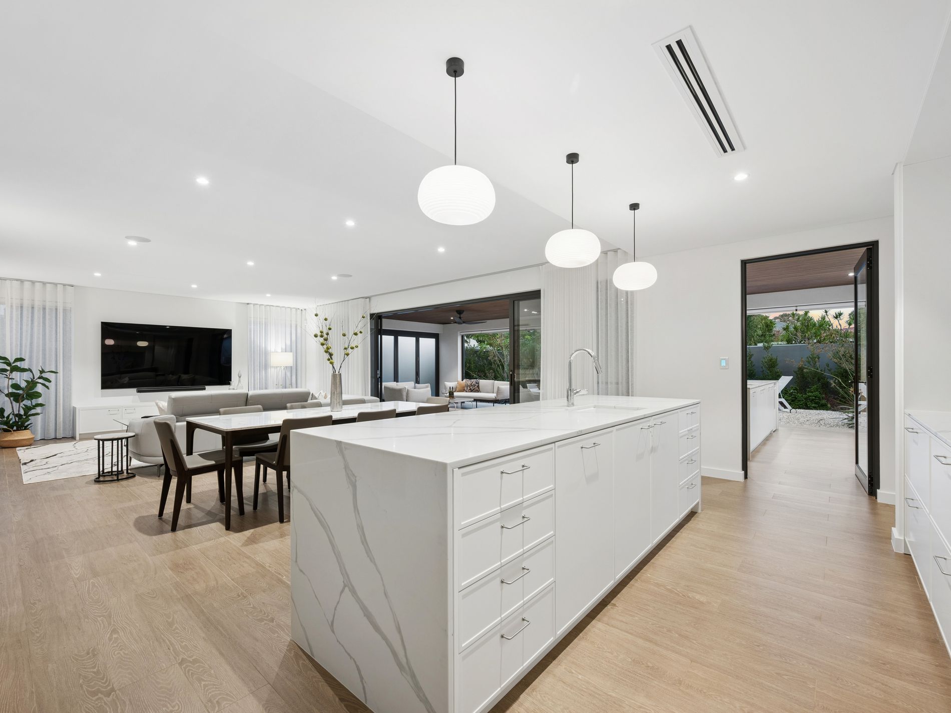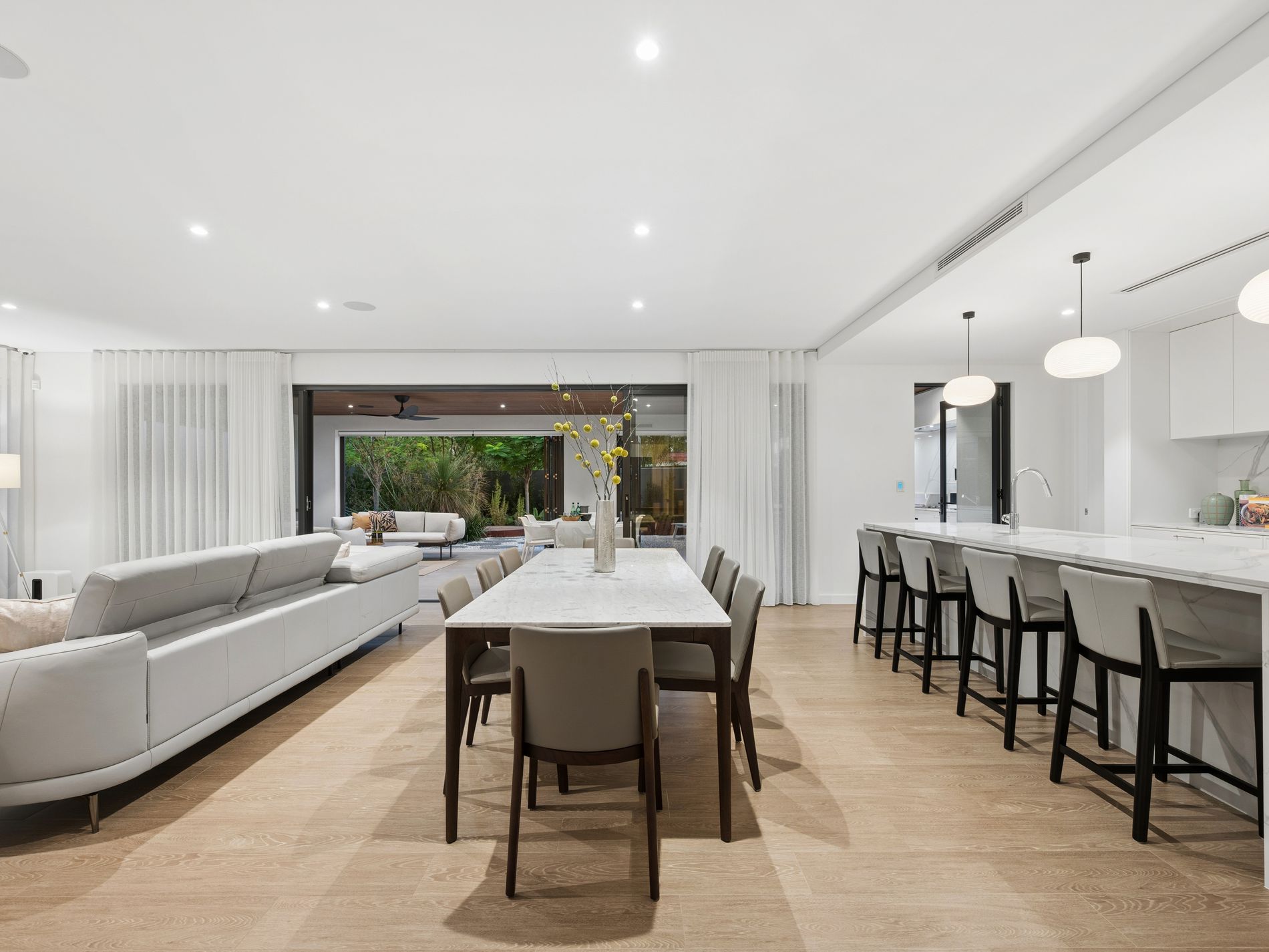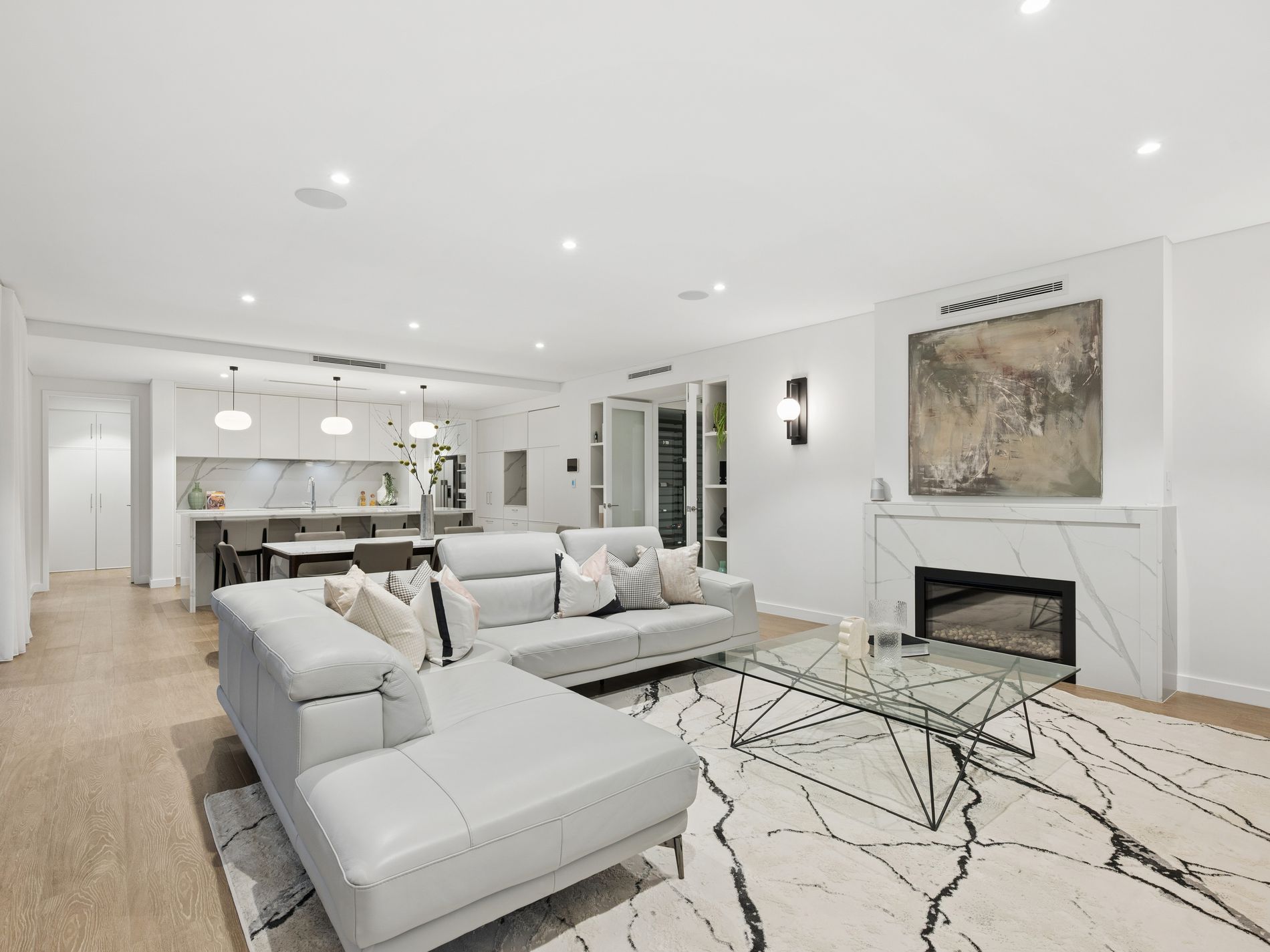 The heart of the home unfolds into a vast open plan living and dining domain anchored by a striking marble wrapped gas fireplace and designer built in cabinetry. The gourmet kitchen is both beautiful and functional, showcasing waterfall stone surfaces, integrated refrigeration, European appliances including induction cooking, integrated dishwasher and extensive storage. A fully appointed butler's pantry elevates the experience further with double ovens, double sinks, additional fridge space and exceptional preparation areas, perfectly suited for large scale entertaining.