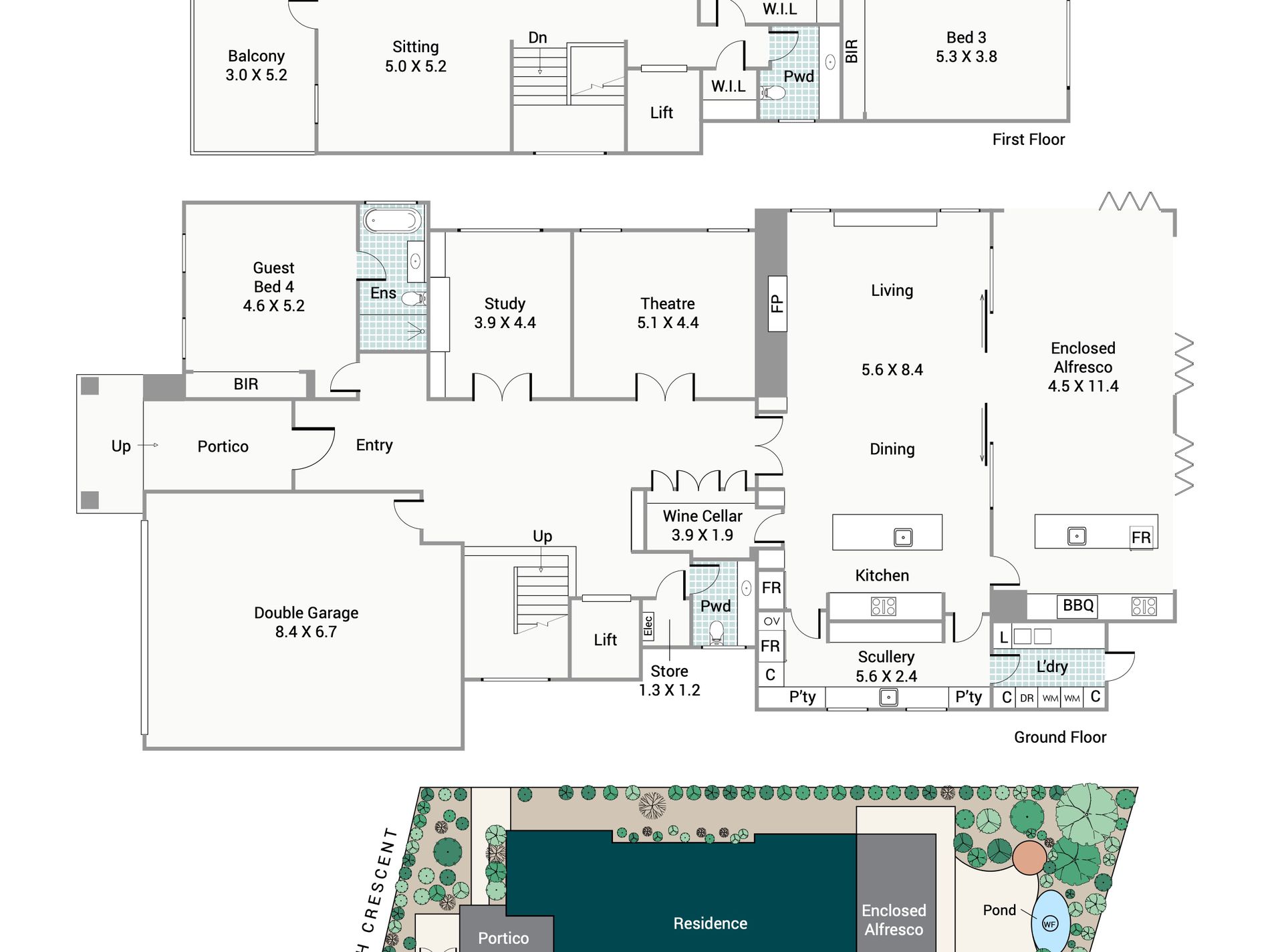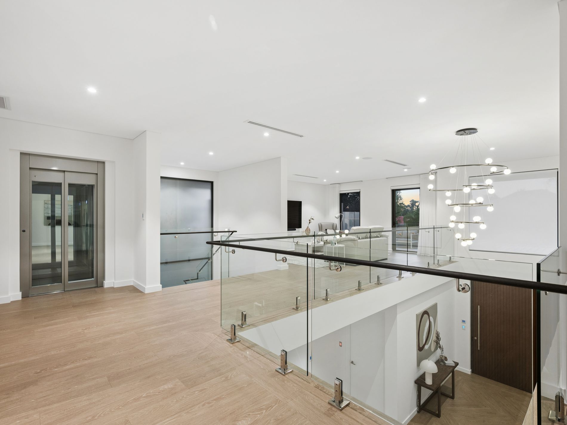 An elevated timber lined portico and oversized timber door introduce a breathtaking double height entry crowned by a dramatic feature chandelier. Rich textures, parquet style timber look tiling, bespoke cabinetry and glass balustrading with black accents create an immediate sense of understated luxury. The ground floor offers exceptional versatility with a sumptuous guest suite featuring triple robes and private ensuite, a dedicated home theatre behind double glass doors and a substantial executive study with custom joinery.