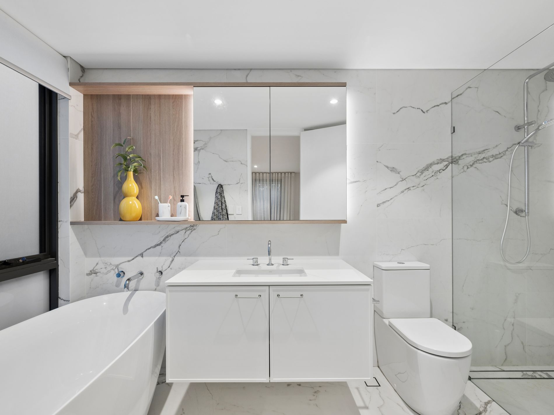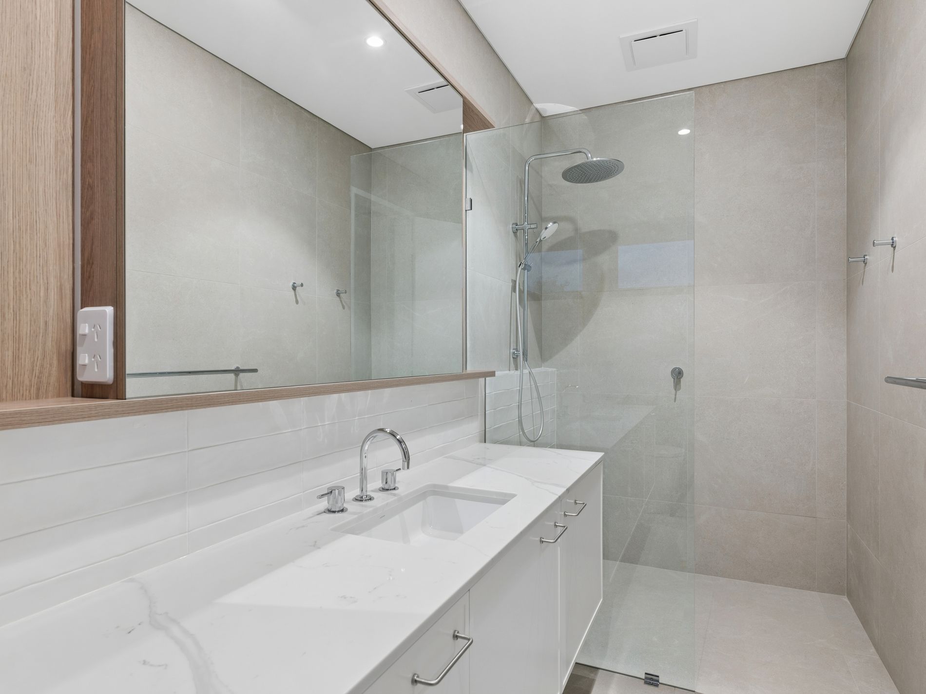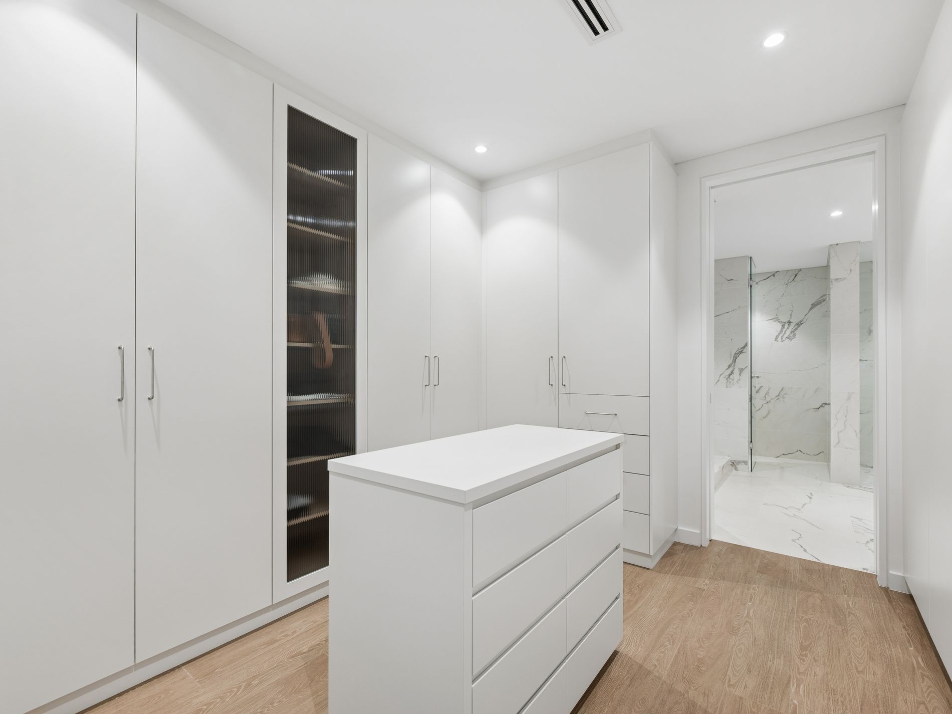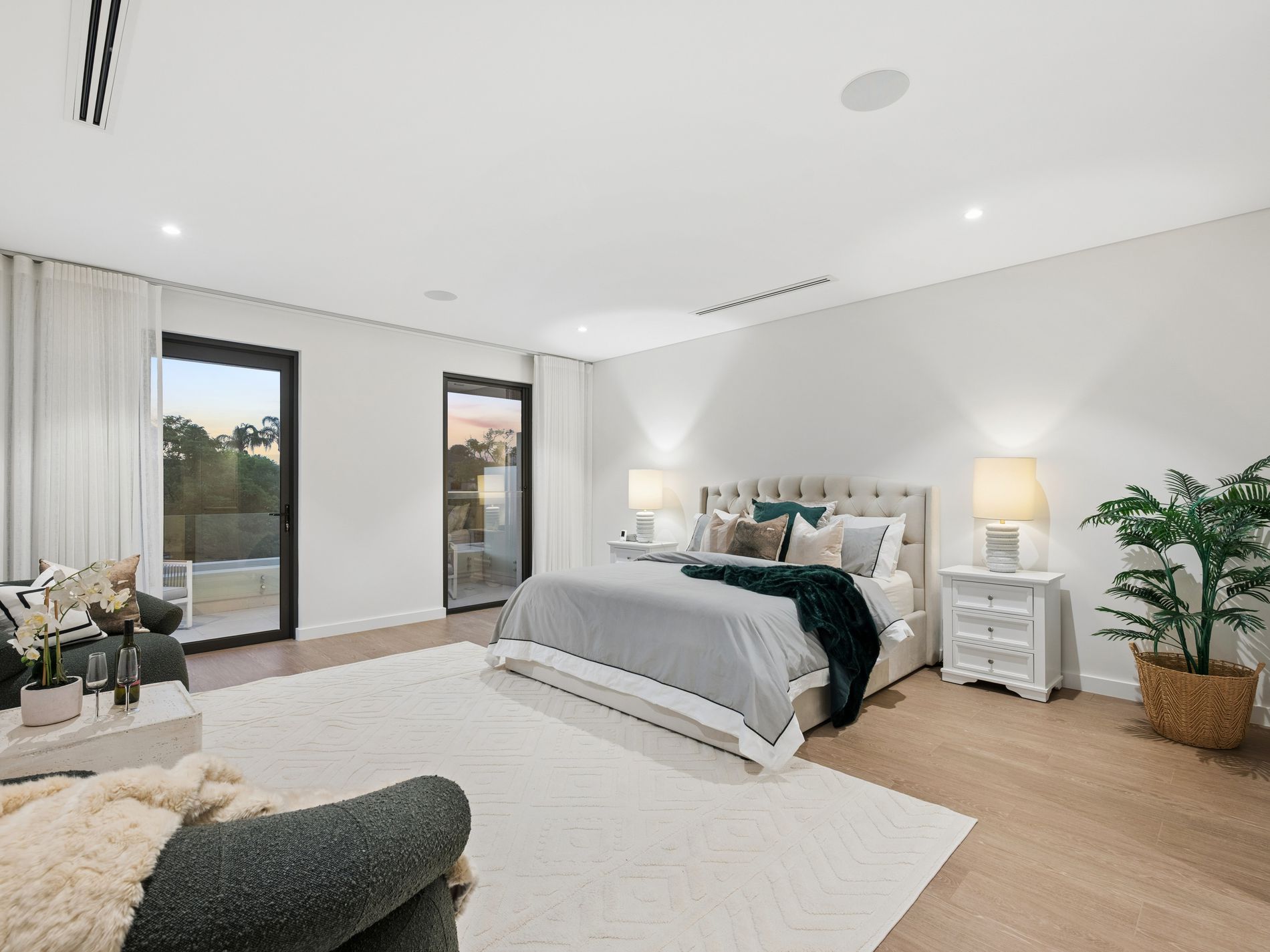 The upper level continues the sense of grandeur with an additional living retreat opening to a front balcony and two generously proportioned bedroom suites, each complete with their own designer ensuite and custom robes. The master suite is a true showpiece, offering balcony access with city glimpses, a boutique style walk in robe with central island and a luxurious hotel inspired ensuite featuring freestanding bath, double vanity, waterfall shower and separate toilet.