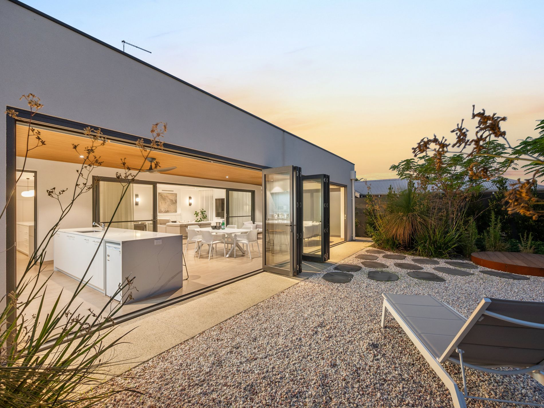 Seamless indoor outdoor integration leads to a magnificent alfresco retreat with timber lined ceiling, ceiling fans and a fully equipped outdoor kitchen featuring BBQ, gas cooktop, rangehoods and sink. Bifold doors open to a tranquil Zen garden with water feature and stepping stones, creating a private resort inspired sanctuary.